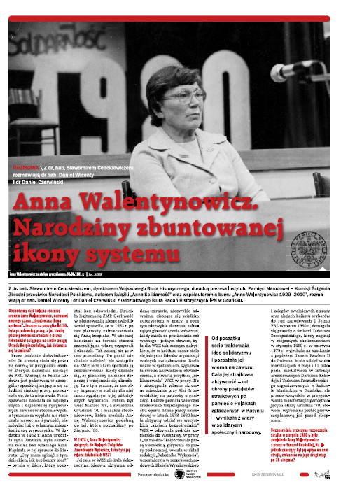 - „Anna Walentynowicz. Narodziny zbuntowanej ikony systemu” – rozmowa dr. hab. Daniela Wicentego i dr. Daniela Czerwińskiego z Oddziałowego Biura Badań Historycznych IPN w Gdańsku z dr. hab. Sławomirem Cenckiewiczem, dyrektorem Wojskowego Biura Historycznego, doradcą prezesa Instytutu Pamięci Narodowej.
