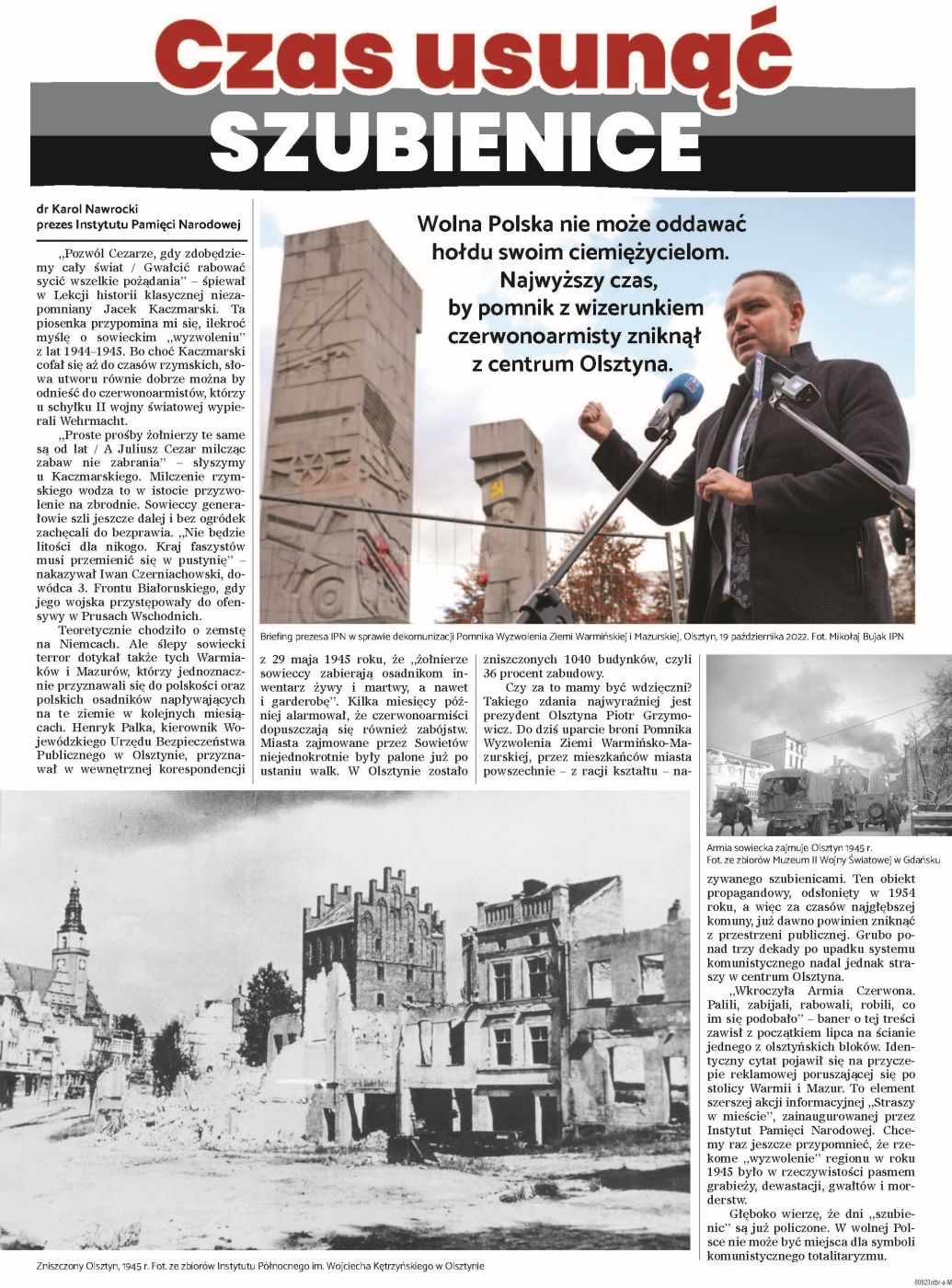 „Pozwól Cezarze, gdy zdobędziemy cały świat / Gwałcić rabować sycić wszelkie pożądania” – śpiewał w Lekcji historii klasycznej niezapomniany Jacek Kaczmarski. Ta piosenka przypomina mi się, ilekroć myślę o sowieckim „wyzwoleniu” z lat 1944–1945. Bo choć Kaczmarski cofał się aż do czasów rzymskich, słowa utworu równie dobrze można by odnieść do czerwonoarmistów, którzy u schyłku II wojny światowej wypierali Wehrmacht. - Adam Siwek, dyrektor Biura Upamiętniania Walk i Męczeństwa Instytutu Pamięci Narodowej, Refleksje historyka nad dekomunizacją