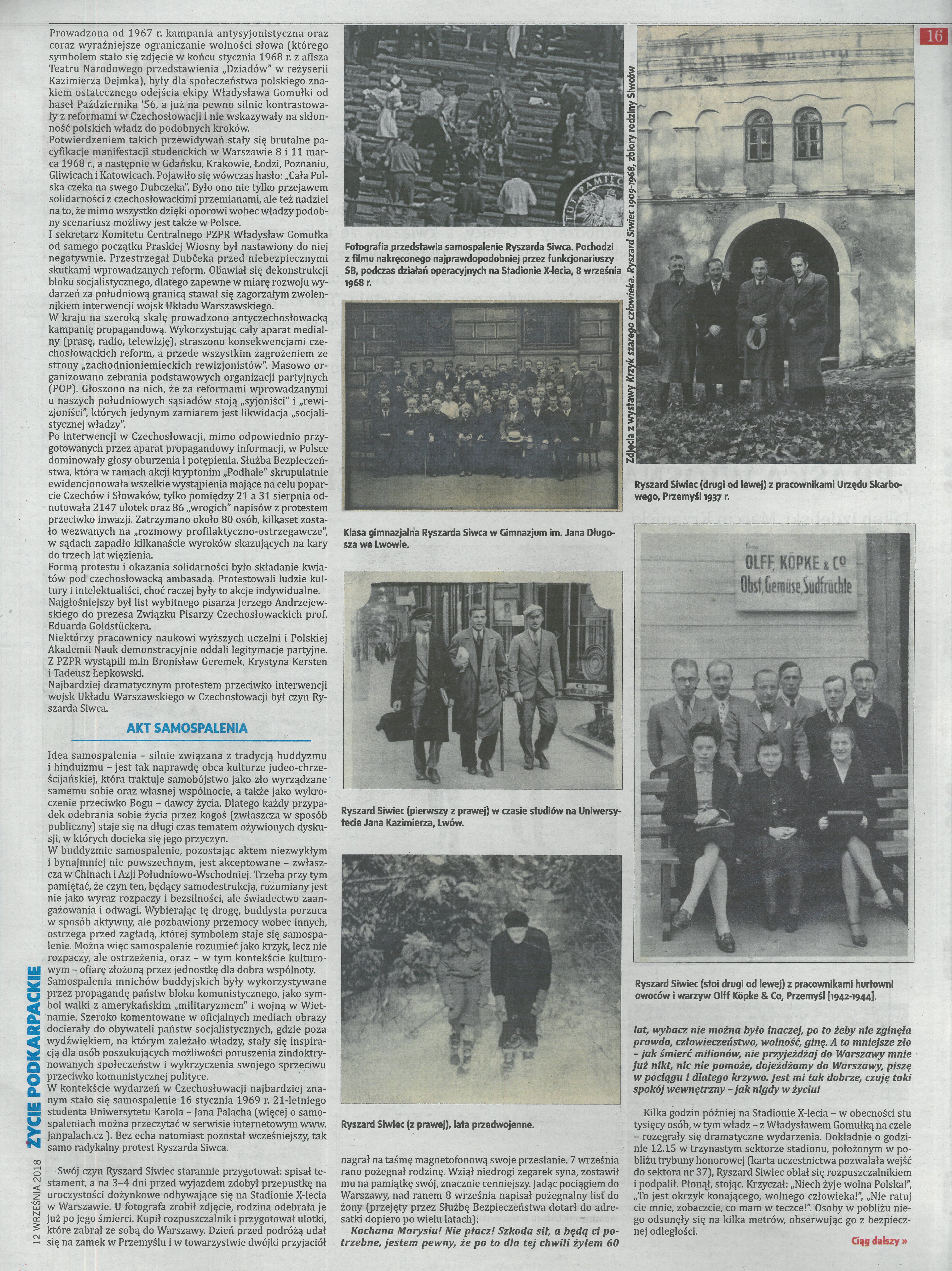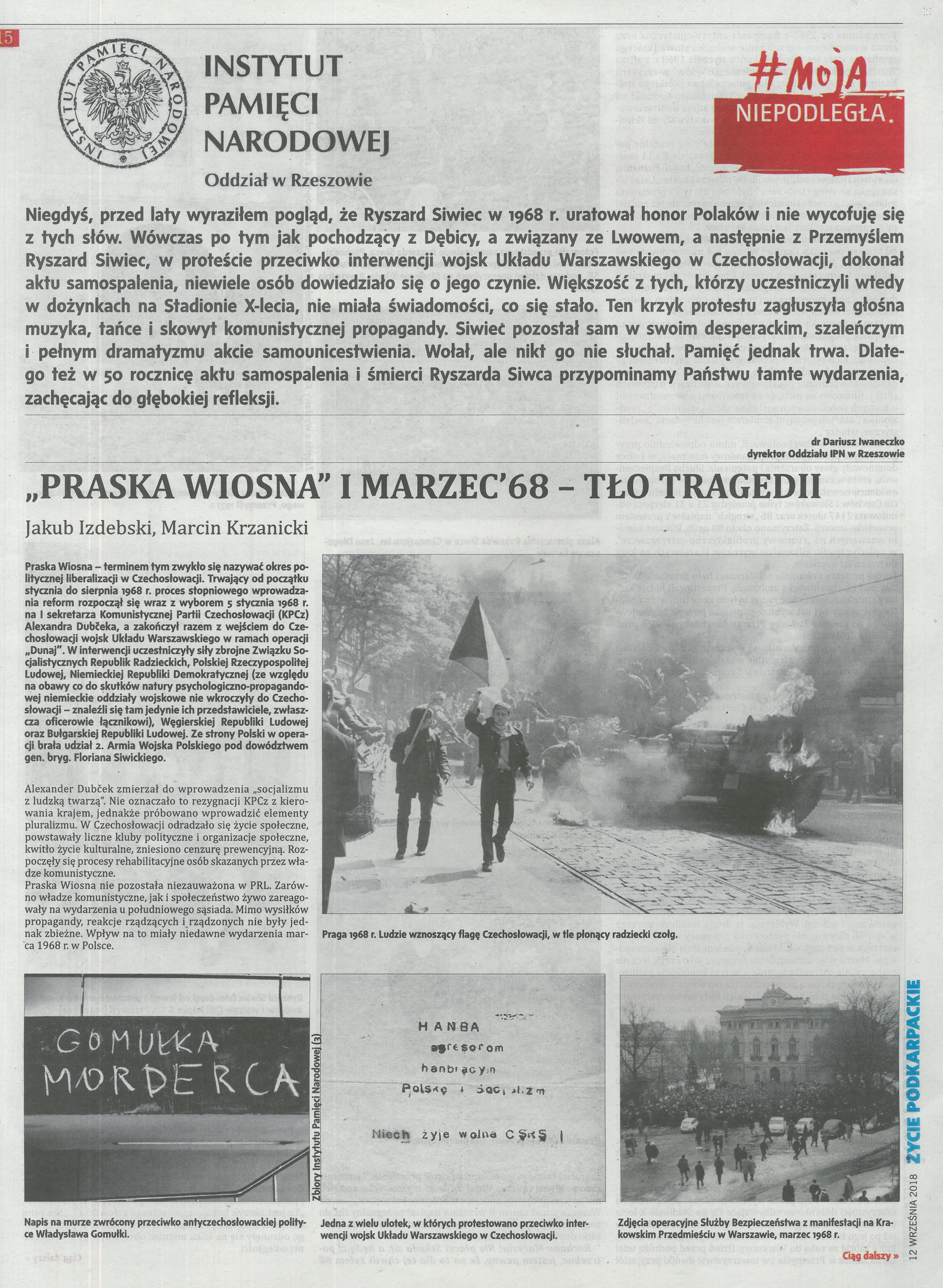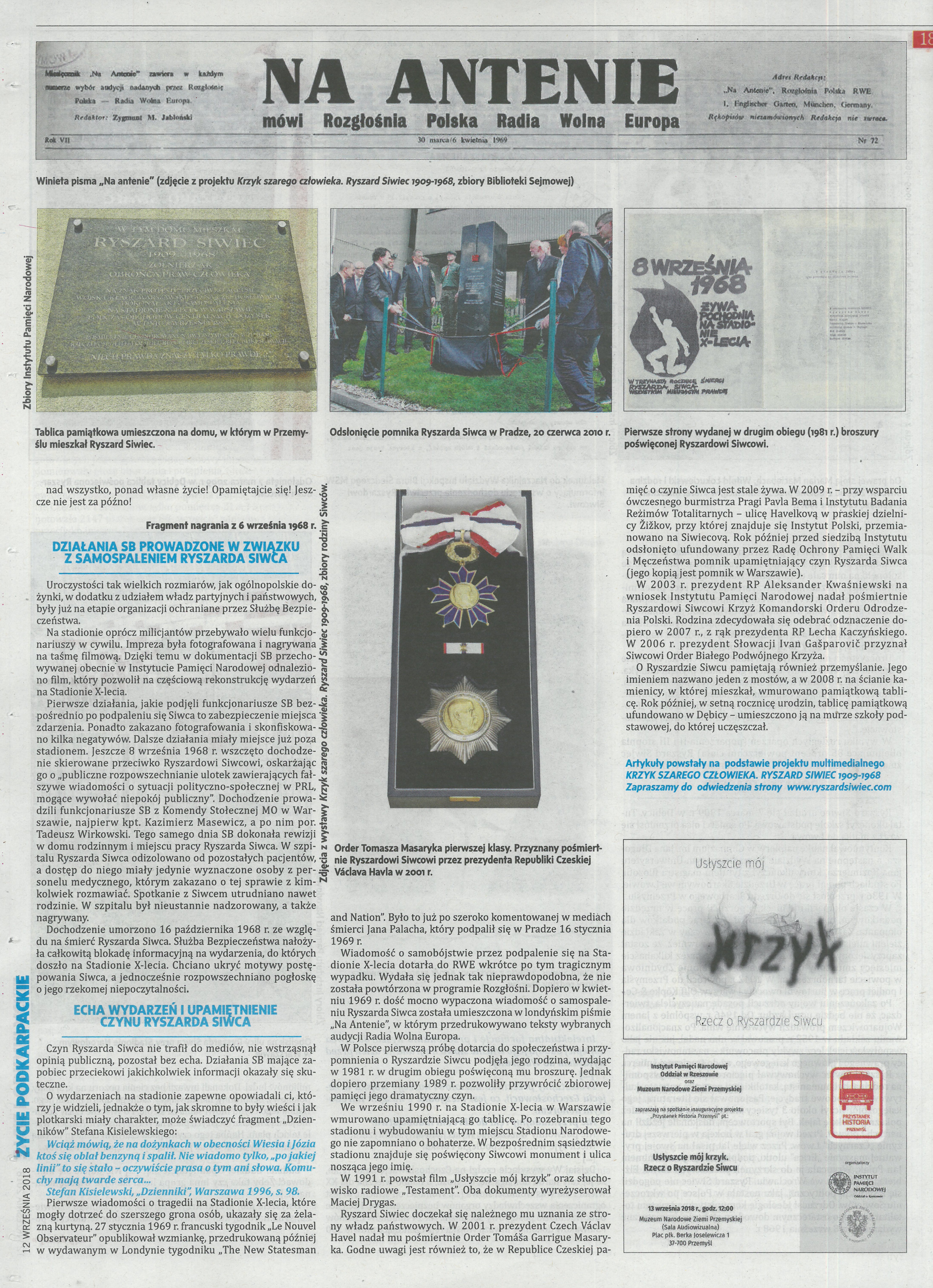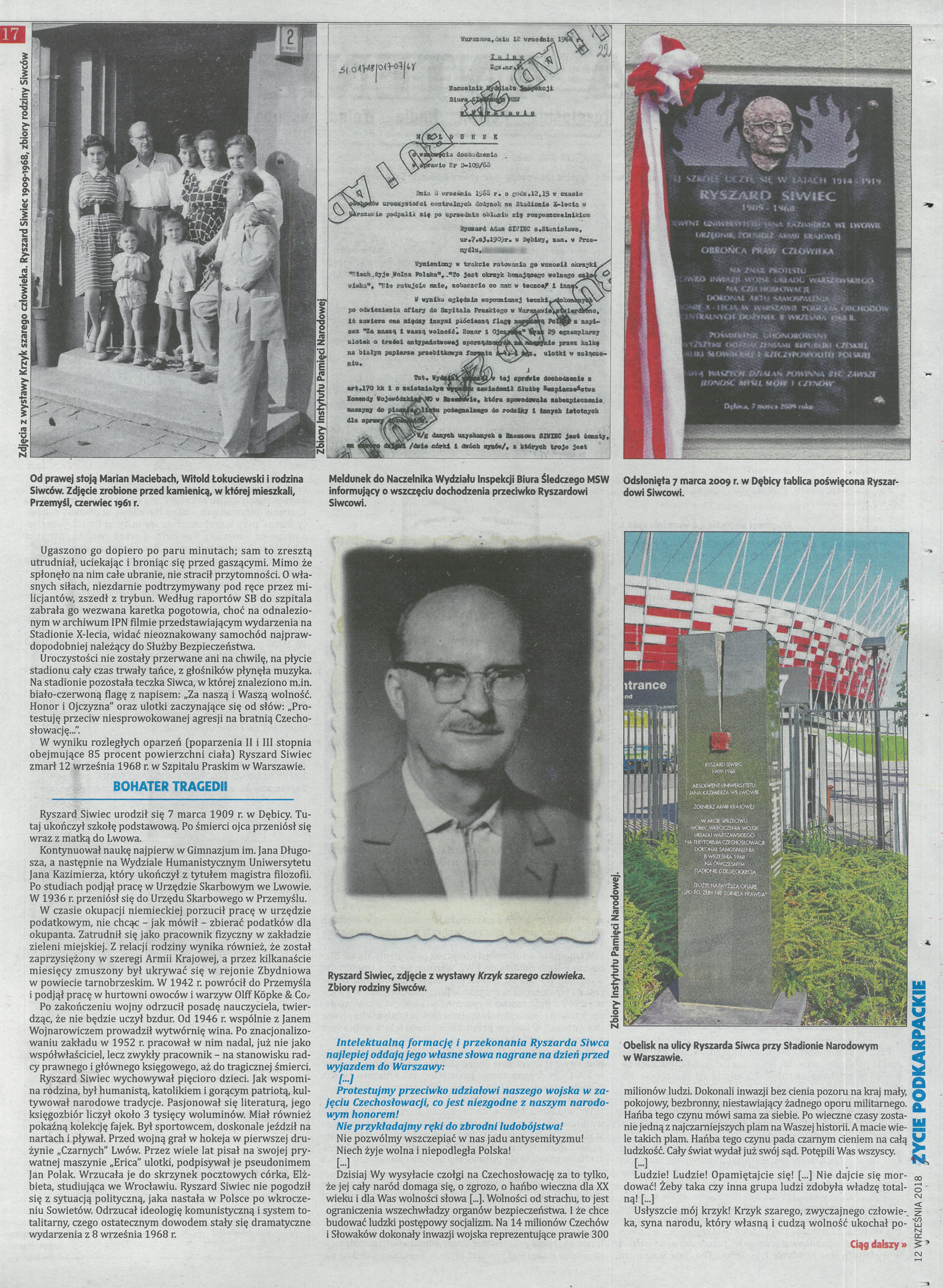 12 września mija 50. rocznica śmierci Ryszarda Siwca, który w proteście przeciwko inwazji na Czechosłowację, dokonał 8 września 1968 r. samospalenia w czasie ogólnokrajowych dożynek na Stadionie Dziesięciolecia w Warszawie. Przed wyjazdem na dożynki sporządził testament oraz nagrał na taśmę magnetofonową antykomunistyczne przesłanie. Kończyły je słowa: „Ludzie, w których może jeszcze tkwi iskierka ludzkości, uczuć ludzkich, opamiętajcie się! Usłyszcie mój krzyk, krzyk szarego, zwyczajnego człowieka, syna narodu, który własną i cudzą wolność ukochał ponad wszystko, ponad własne życie, opamiętajcie się! Jeszcze nie jest za późno!