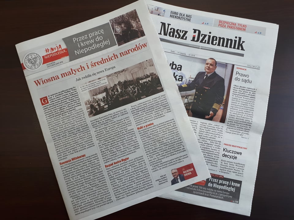 W środowym numerze „Naszego Dziennika” (14.11.2018 r.) ukazał się dodatek historyczny IPN „Przez pracę i krew do Niepodległej” wydany z okazji 100. rocznicy odzyskania niepodległości przez Polskę. W dodatku pojawiły się następujące artykuły:
