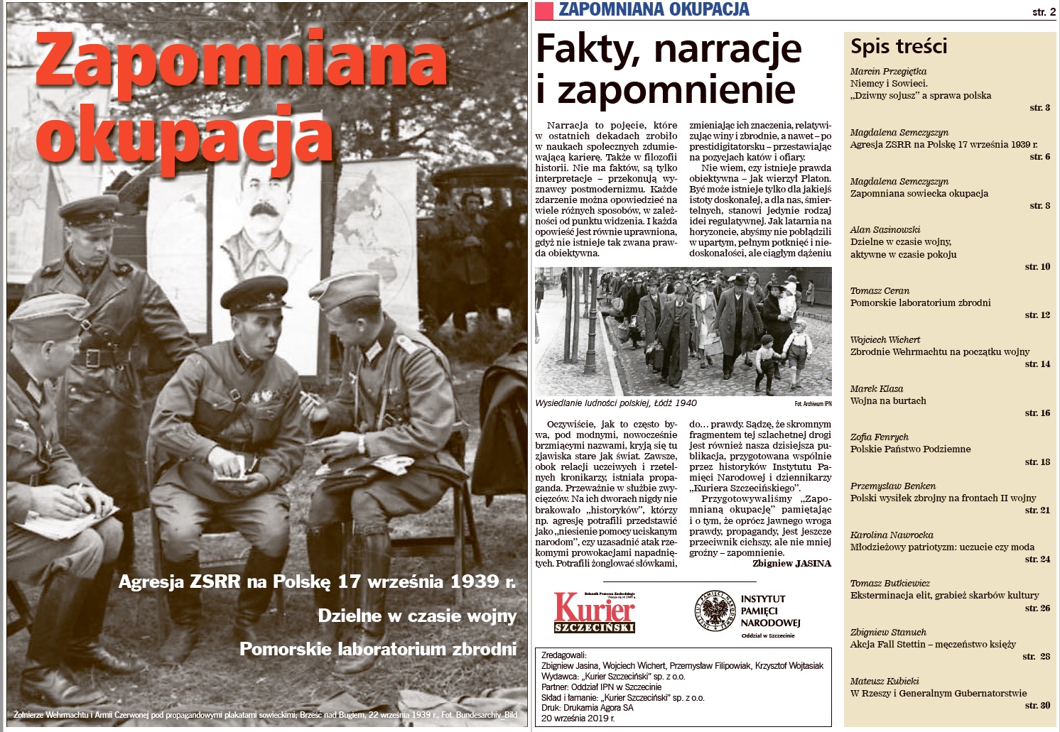 Dodatek historyczny ,,Zapomniana okupacja", opracowany wspólnie przez historyków Instytutu Pamięci Narodowej i dziennikarzy „Kuriera Szczecińskiego”, koncentruje się na przedstawieniu wybranych aspektów historii Polski w okresie II wojny światowej. Jego lejtmotywem jest obchodzona kilka dni temu 80. rocznica agresji ZSRR na II RP oraz mniej obecna w świadomości historycznej okupacja sowiecka ziem polskich w latach 1939-1941. W publikacji znajdują się również teksty poruszające zagadnienia współpracy niemiecko-radzieckiej w kontekście IV rozbioru Polski, polityki rasowej i zbrodni okupanta niemieckiego, a także polskiego wysiłku zbrojnego na frontach II wojny światowej i konspiracji w kraju. Ponadto, przedstawione zostały m.in. sylwetki dwóch znanych mieszkanek Szczecina, Danuty Szyksznian-Ossowskiej i Krystyny Łyczywek, które jako łączniczki AK dowiodły swej dzielności podczas zawieruchy wojennej, jak również refleksje o współczesnym młodzieżowym patriotyzmie. Przygotowywaliśmy „Zapomnianą okupację” pamiętając i o tym, że oprócz jawnego wroga prawdy, propagandy i relatywizmu historycznego, jest jeszcze przeciwnik cichszy, ale nie mniej groźny – zapomnienie.