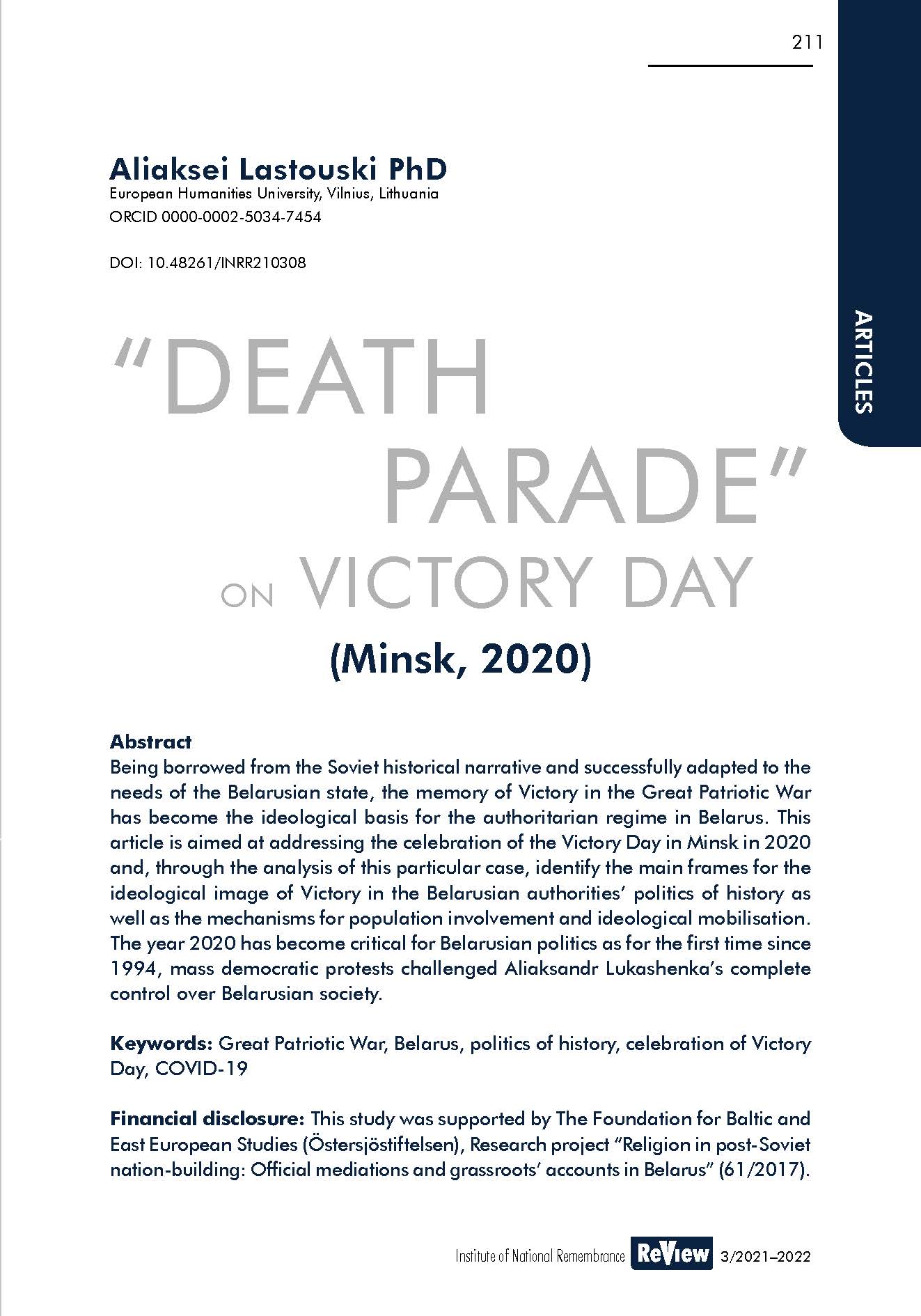 Abstract: Being borrowed from the Soviet historical narrative and successfully adapted to the needs of the Belarusian state, the memory of Victory in the Great Patriotic War has become the ideological basis for the authoritarian regime in Belarus. This article is aimed at addressing the celebration of the Victory Day in Minsk in 2020 and, through the analysis of this particular case, identify the main frames for the ideological image of Victory in the Belarusian authorities’ politics of history as well as the mechanisms for population involvement and ideological mobilisation. The year 2020 has become critical for Belarusian politics as for the first time since 1994, mass democratic protests challenged Aliaksandr Lukashenka’s complete control over Belarusian society.