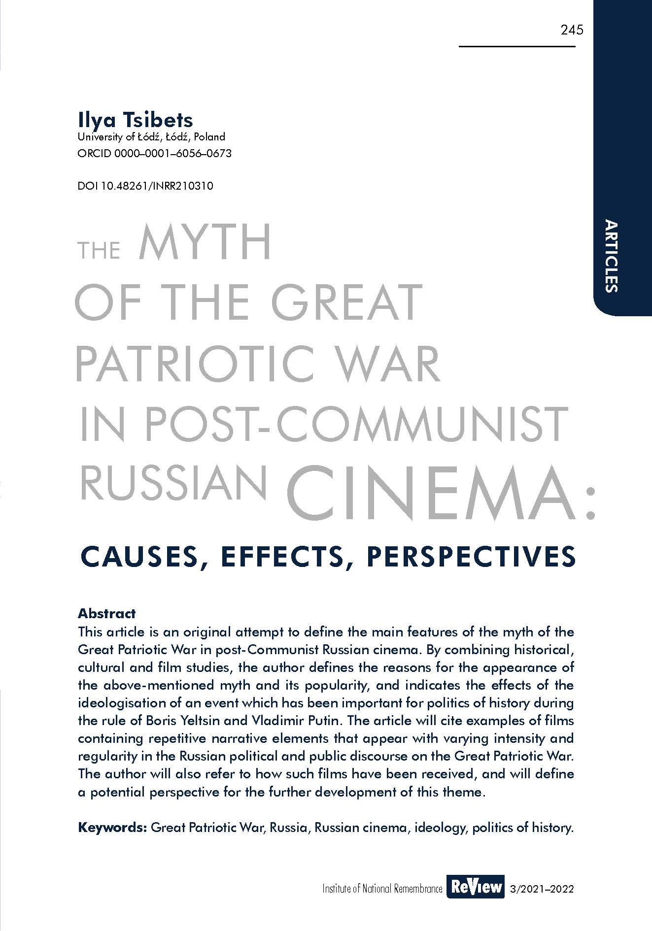 Keywords: Great Patriotic War, Russia, Russian cinema, ideology, politics of history.