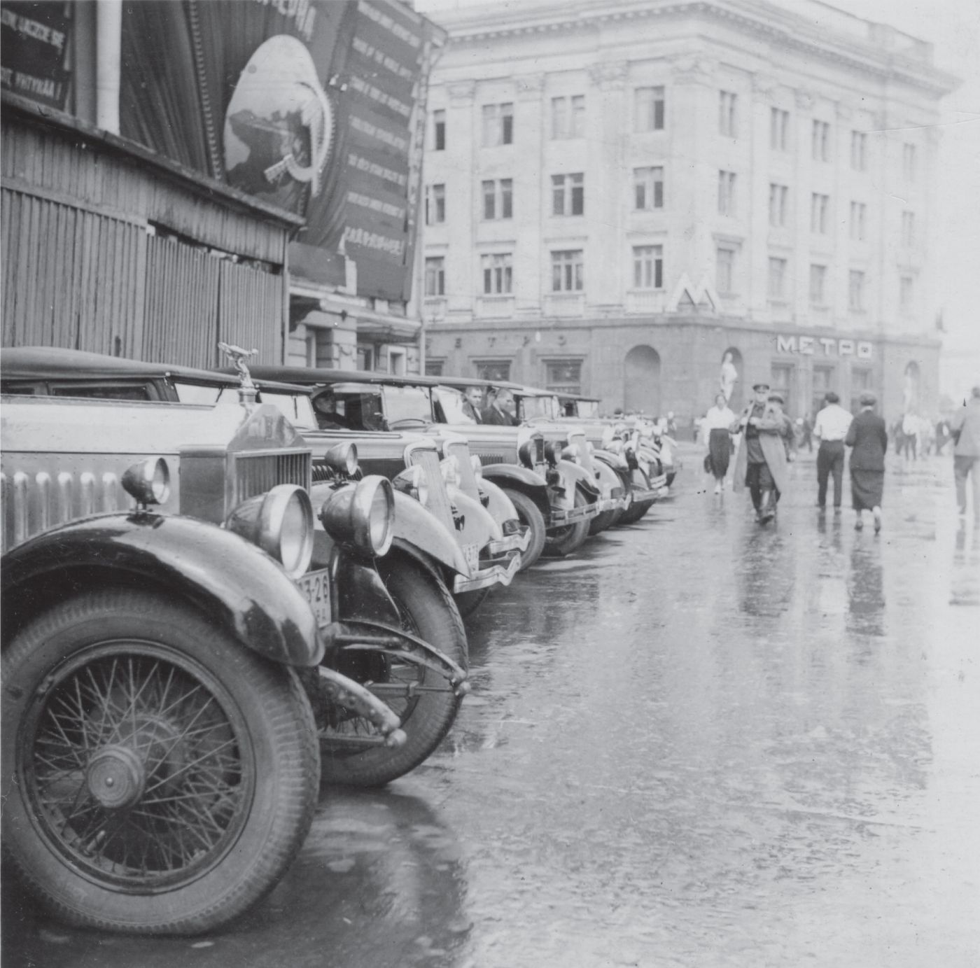 Samochody uczestników VII Wszechświatowego Kongresu Kominternu zaparkowane przed domem Związków u zbiegu ulicy Ochotnyj riad i Bolszaja Dmitrowka. Moskwa, sierpień 1935 r. -