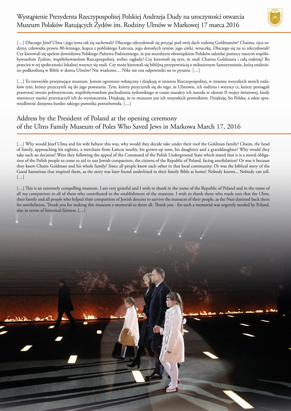 Wystąpienie Prezydenta RP Andrzeja Dudy na uroczystości otwarcia Muzeum Polaków Ratujących Żydów podczas II wojny światowej