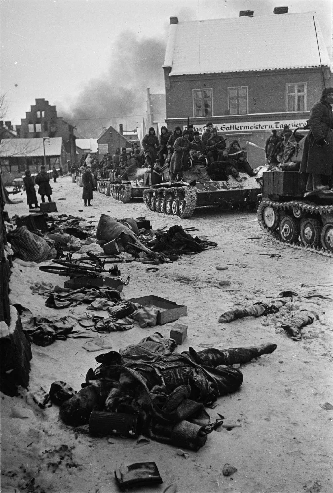 Sowieckie wojsko w Młynarach. Na poboczu leżą ciała pomordowanych. Fot. ze zbiorów Muzeum II Wojny Światowej w Gdańsku, nr inwentarzowy: 0016-7
