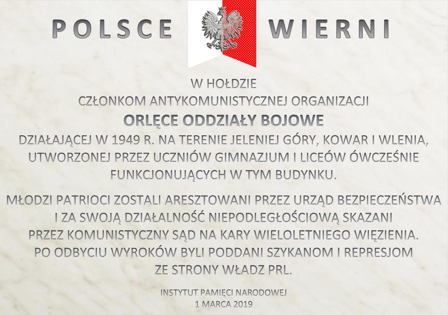 27 lutego 2019 roku o godz. 12.00 w I Liceum Ogólnokształcącym w Jeleniej Górze odbyło się uroczyste odsłonięcie tablicy pamiątkowej poświęconej członkom antykomunistycznej organizacji „Orlęce Oddziały Bojowe”. W uroczystości wzięła udział dr Katarzyna Pawlak-Weiss, zastępca dyrektora Oddziału IPN we Wrocławiu oraz Naczelnik Oddziałowego Biura Upamiętniania Walk i Męczeństwa Wojciech Trębacz.