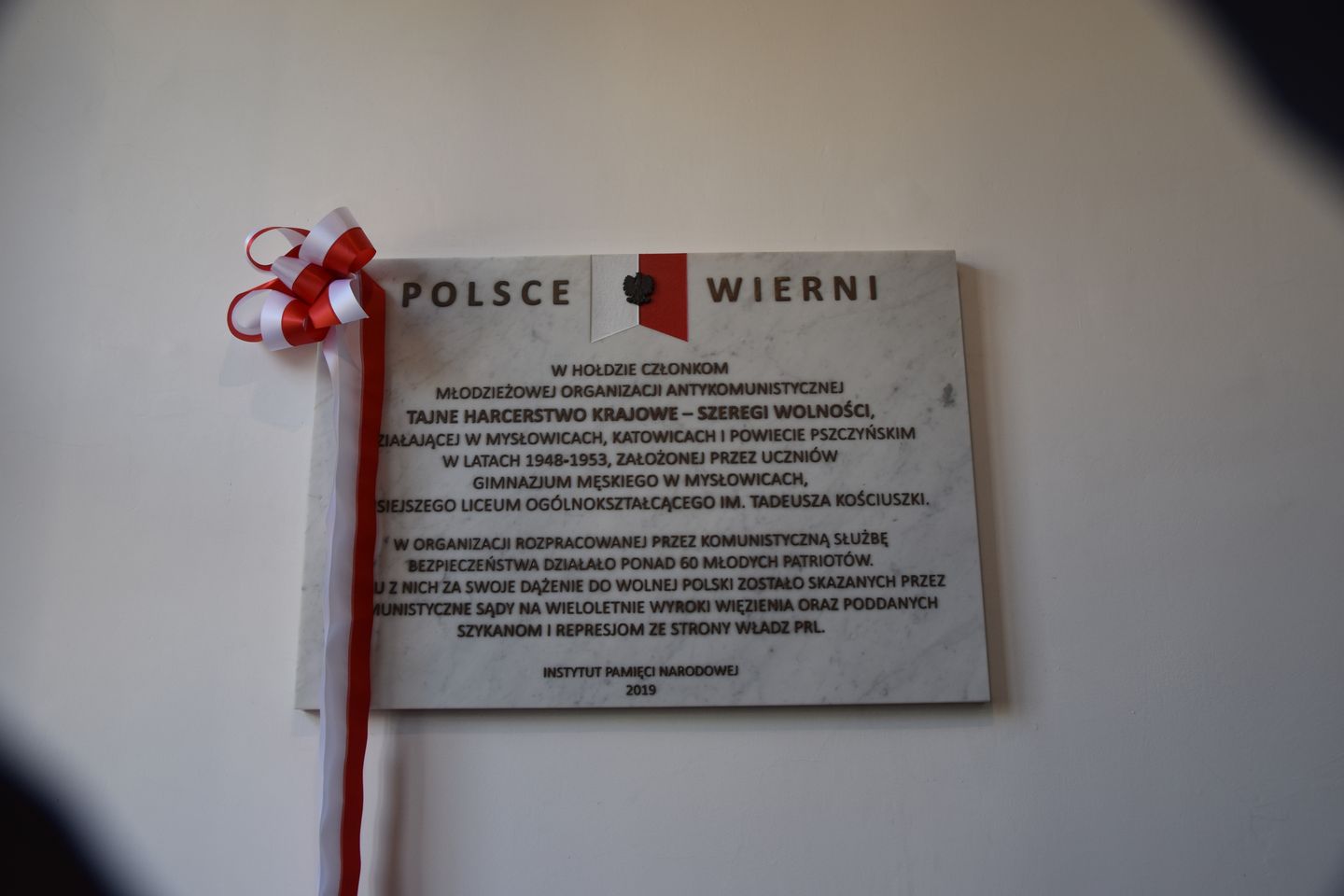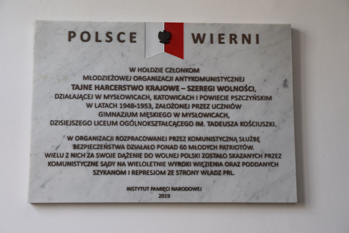 W czwartek, 28 lutego 2019 r., w I Liceum Ogólnokształcącym im. T. Kościuszki w Mysłowicach, woj. śląskie, odbyło się uroczyste odsłonięcie tablicy poświęconej członkom organizacji Tajne Harcerstwo Krajowe – Szeregi Wolności, działającej w latach 1948–1953.