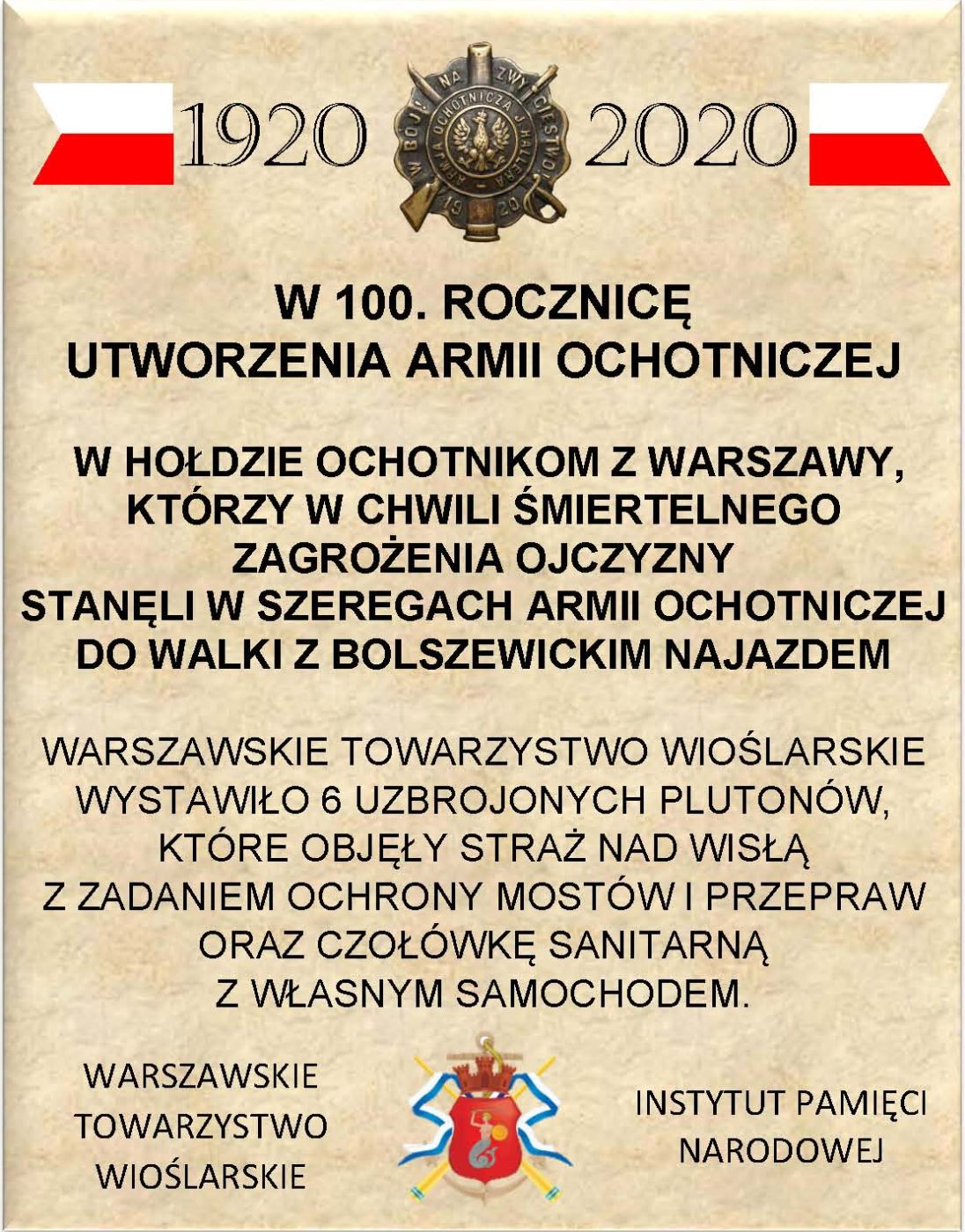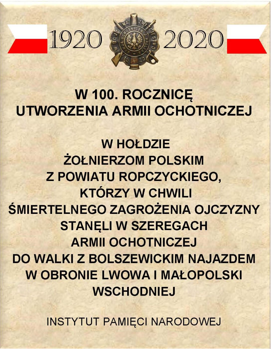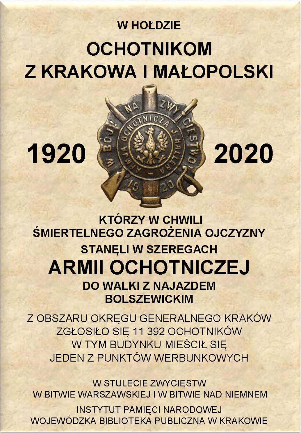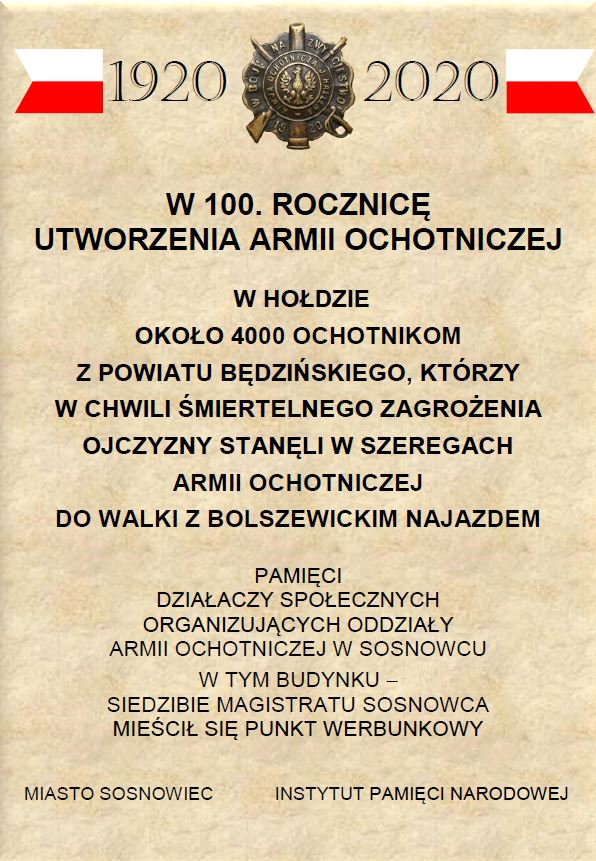 W setną rocznicę zwycięstwa nad bolszewikami w Bitwie Warszawskiej 1920 r. Instytut Pamięci Narodowej upamiętni żołnierzy Armii Ochotniczej gen. Józefa Hallera 1920 r. poprzez odsłonięcie tablic memoratywnych w miejscach komisji werbunkowych.