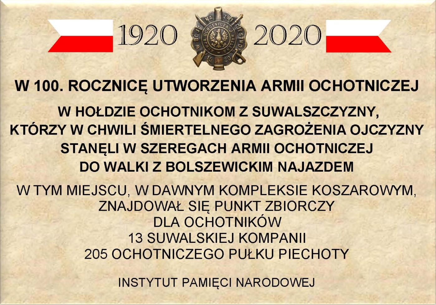sierpień/wrzesień 2020, Suwałki – odsłonięcie tablicy w miejscu punktu zbornego ochotników Suwalskiej Kompanii 205 Pułku Ochotniczego (teren dawnych koszar, obecnie szkoła Sióstr Salezjanek, ul. Sejneńska)