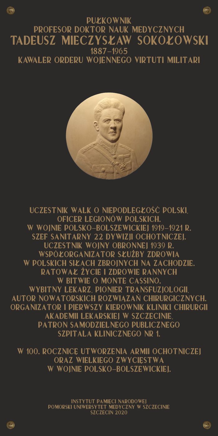 20 lipca 2020, Szczecin – na gmachu Samodzielnego Publicznego Szpitala Klinicznego nr 1 im. prof. Tadeusza Sokołowskiego Pomorskiego Uniwersytetu Medycznego w Szczecinie, ul. Unii Lubelskiej 1 zostanie odsłonięta tablica upamiętniająca patrona placówki.​
