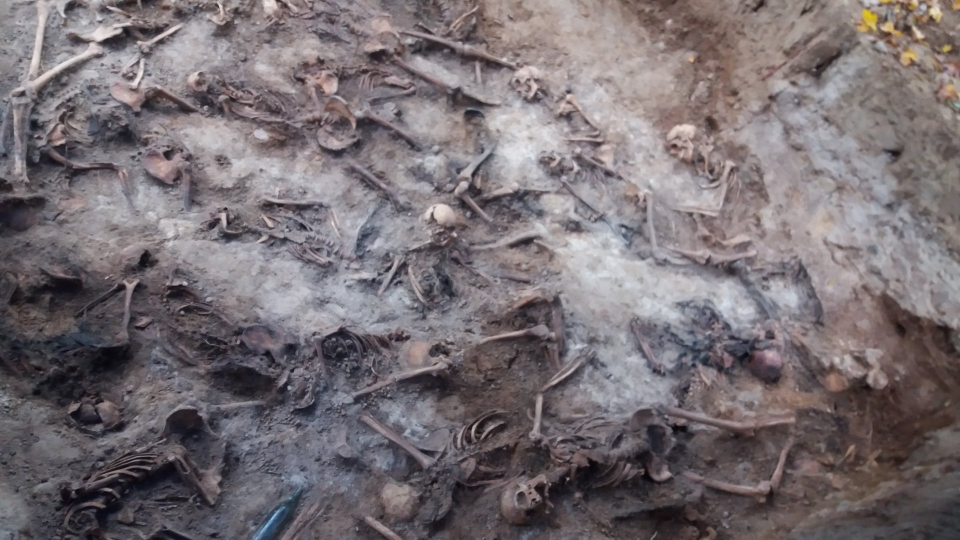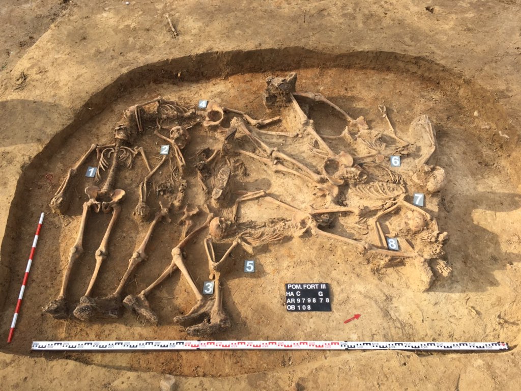 fot. Szczątki 8 żołnierzy Wojska Polskiego poległych w obronie Fortu III we wrześniu 1939. Pogrzebani po zajęciu fortu przez Niemców w płytkim dole na środku prawego dziedzińca.