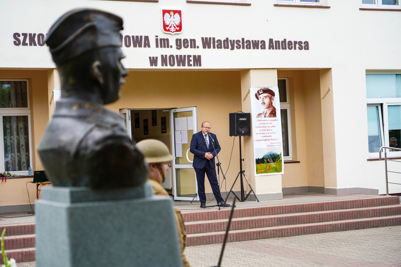 W samo południe 25 czerwca 2021 r. w Szkole Podstawowej im. gen. Władysława Andersa w Nowem odbyło się uroczyste odsłonięcie i poświęcenie pomnika gen. Władysława Andersa, sfinansowanego przez Biuro Upamiętniania Walk i Męczeństwa IPN. Podczas uroczystości Instytut Pamięci Narodowej reprezentowali dyrektor Biura Upamiętniania Walk i Męczeństwa Adam Siwek, zastępca dyrektora BUWiM Joanna Piskorz oraz naczelnik Oddziałowego Biura Upamiętniania Walk i Męczeństwa IPN w Łodzi Bartosz Bijak. Uroczystość rozpoczął hymn państwowy odśpiewany na hali sportowej szkoły, po którym zostały rozdane świadectwa ukończenia szkoły uczniom ósmej klasy. To właśnie do młodzieży skierował swoje wystąpienie dyrektor BUWiM Adam Siwek.