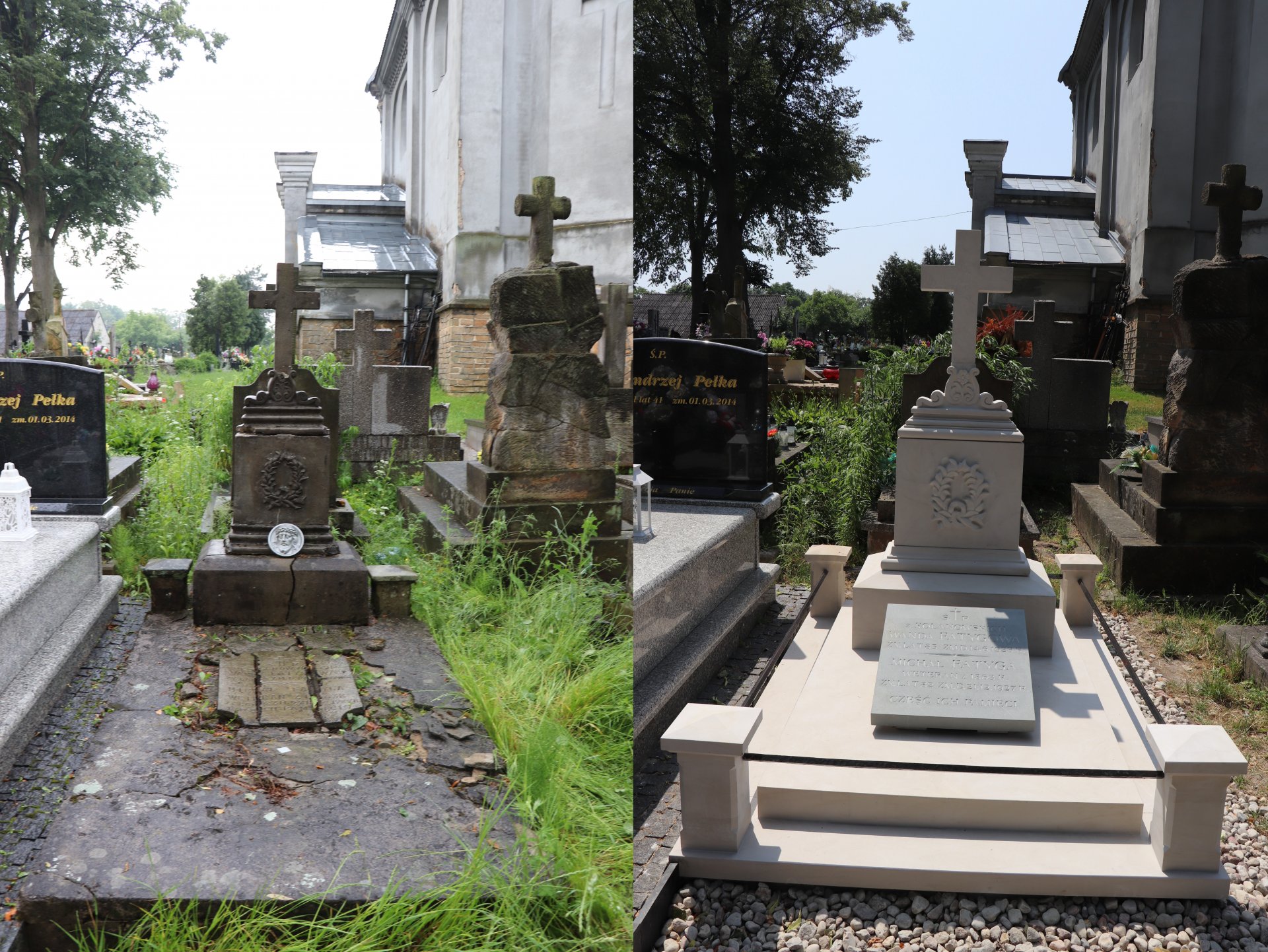 Ze względu na wysoki stopień degradacji obiektu oraz nietrwały materiał (beton) użyty do jego wykonania, pomnik nagrobny został odtworzony w piaskowcu, zgodnie z zaleceniami Wojewódzkiego Urzędu Ochrony Zabytków w Łodzi.
