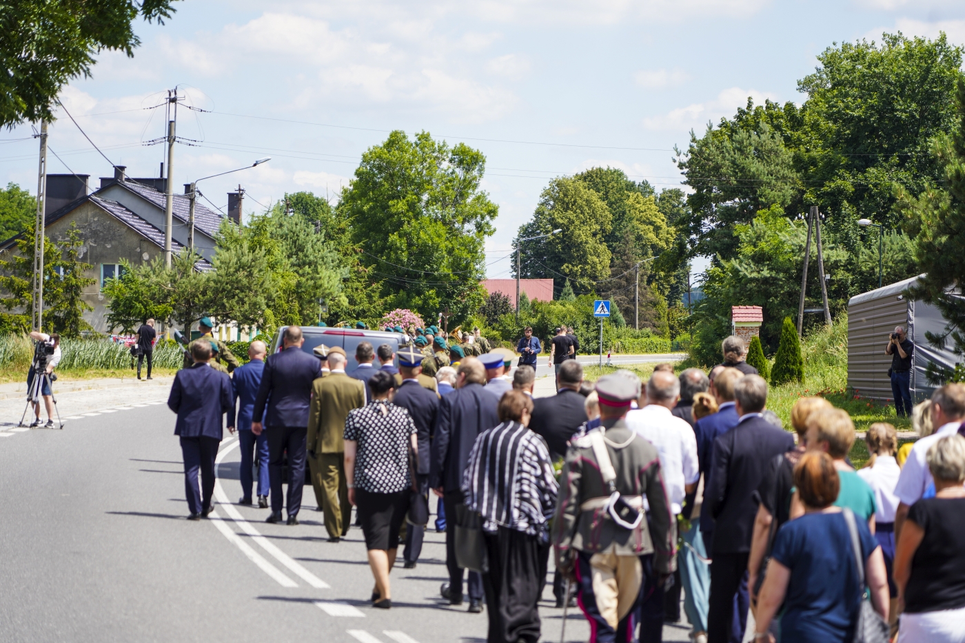 Po mszy pięć trumien ze szczątkami poległych Powstańców, nakrytych flagą państwową, w asyście wojskowej oraz przy wtórze bicia kościelnych dzwonów, wyprowadzono z świątyni. Następnie uczestnicy uroczystości udali się do miejscowości Kalinów (gm. Strzelce Opolskie), gdzie przy kościele pw. Narodzenia NMP utworzono kondukt pogrzebowy prowadzony przez kompanię oraz orkiestrę Wojska Polskiego.
