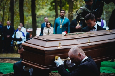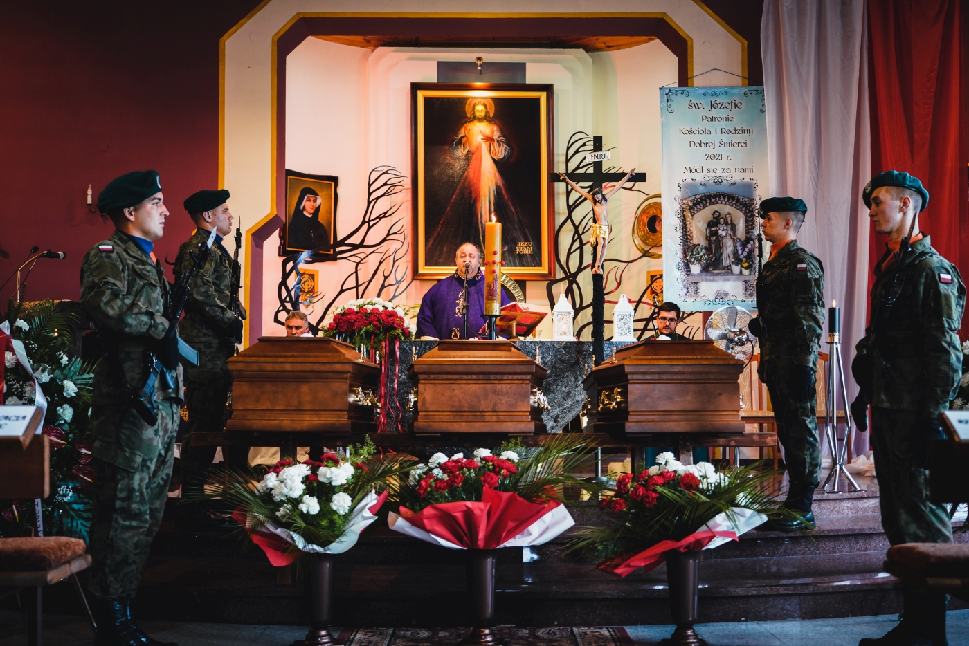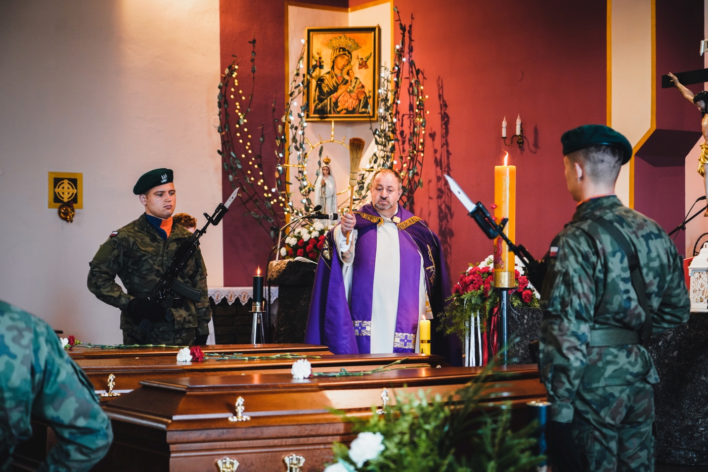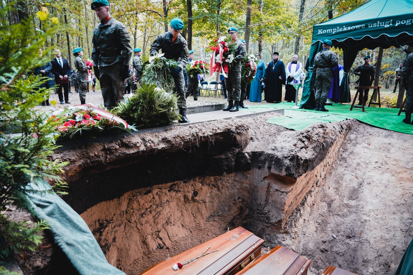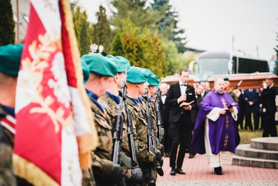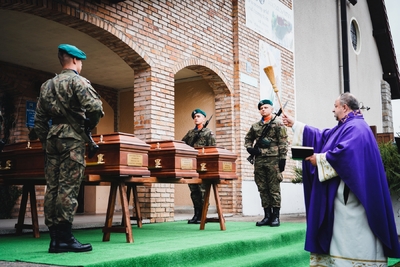 Księża odprawili egzekwie pogrzebowe nad trumnami żołnierzy. Następnie trumny zostały złożone do grobu. Żołnierze spoczęli wśród towarzyszy broni oraz obok ofiar cywilnych. Na koniec ceremonii pogrzebowej kompania reprezentacyjna Wojska Polskiego oddała salwę honorową, a następnie żołnierze w imieniu zebranych delegacji oddając hołd Obrońcom Ojczyzny złożyli wieńce i wiązanki kwiatowe przed kwaterą wojenną.