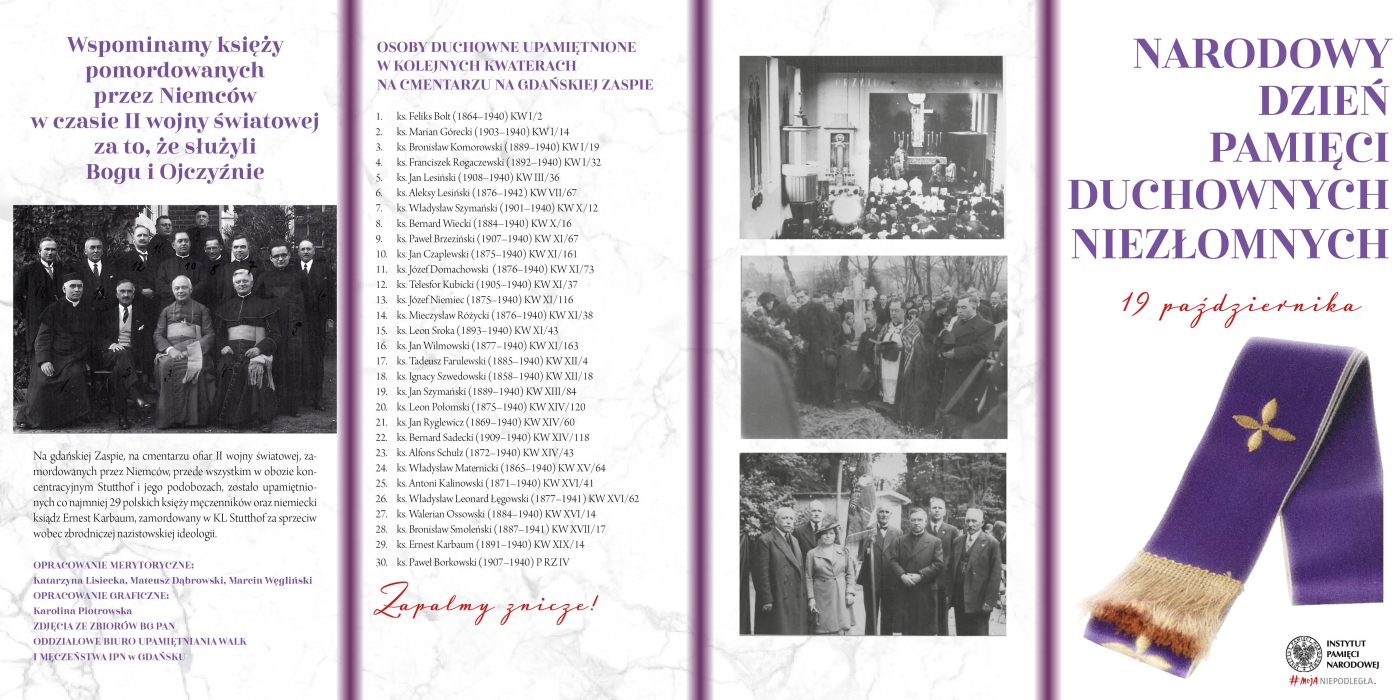 Oddziałowe Biuro Upamiętniania Walk i Męczeństwa IPN w Gdańsku oddało hołd księżom, pomordowanym przez Niemców w czasie II wojny światowej za to, że służyli Bogu i Ojczyźnie. Na cmentarzu na gdańskiej Zaspie, wśród 2086 nagrobków, zostało upamiętnionych co najmniej 29 polskich księży męczenników oraz niemiecki ksiądz Ernest Karbaum, zamordowany za sprzeciw wobec nazistowskiej ideologii. Pracownicy OBUWiM IPN w Gdańsku zapalili Księżom Niezłomnym znicze i otoczyli upamiętnienia biało-czerwoną szarfą. Okolicznościowa publikacja IPN Narodowy Dzień Pamięci Duchownych Niezłomnych została udostępniona wiernym w gdańskich parafiach.