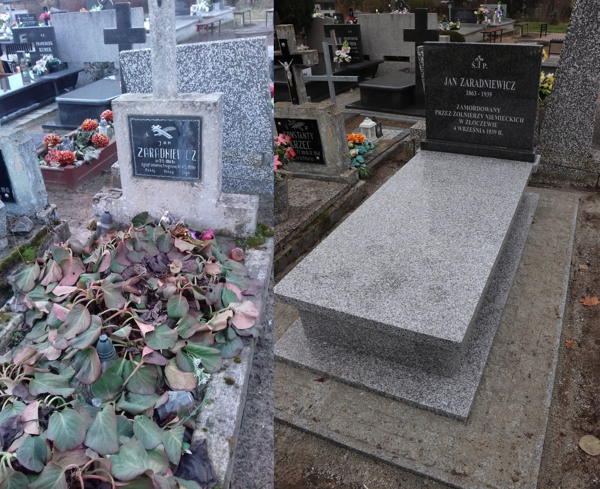 Informujemy, ze zakończyły się prace przy grobie wojennym Jana Zaradniewicza, murarza ze Złoczewa, jednej z ok. 200 ofiar zbrodniczej pacyfikacji miasteczka, którą przeprowadzili żołnierze niemieccy 4 września 1939 r. Stary betonowy nagrobek został zastąpiony współczesną, trwałą formą granitową. Prace zostały sfinansowane przez Oddziałowe Biuro Upamiętniania Walk i Męczeństwa IPN w Łodzi.