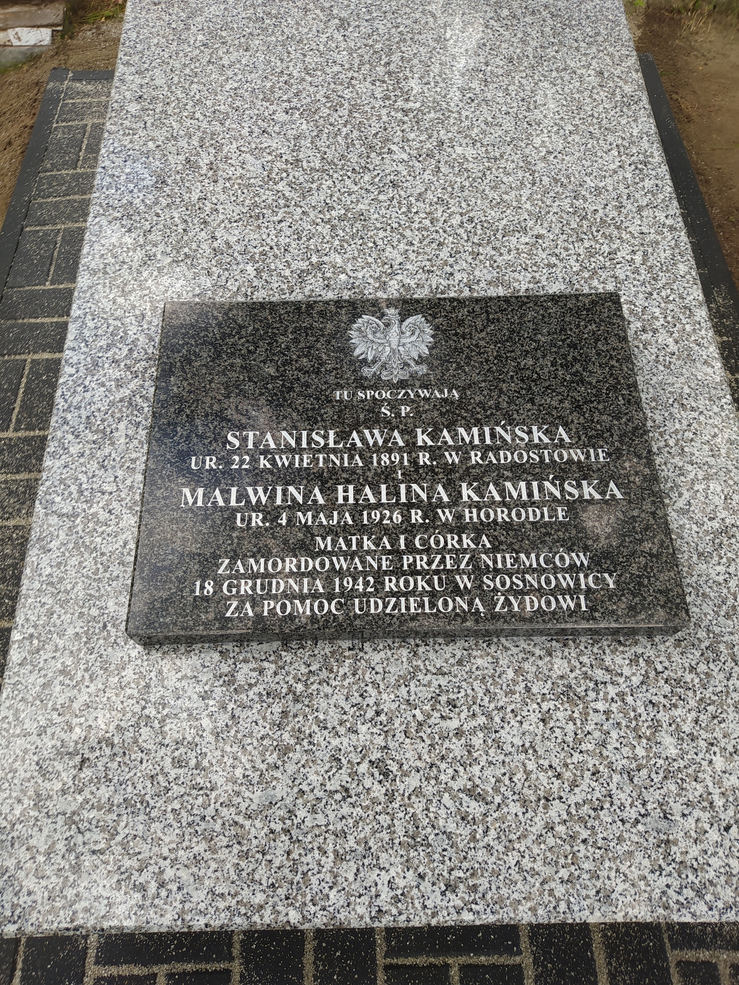 Na cmentarzu parafialnym w Sosnowicy, pow. włodawski zakończyliśmy prace remontowe na mogile wojennej Stanisławy i Malwiny Heleny Kamińskich. Matka i córka zostały zamordowane przez Niemców 18 grudnia 1942 r. w Sosnowicy za pomoc udzieloną Żydowi.