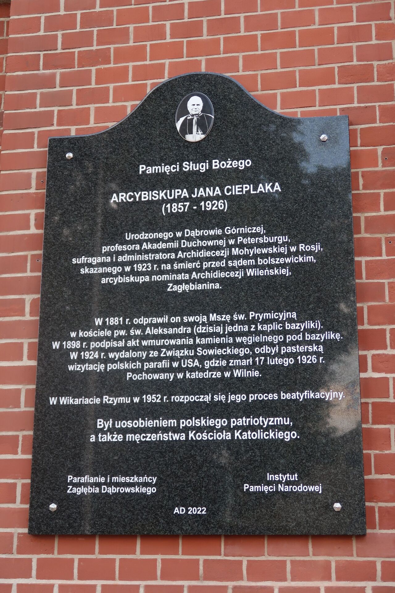 Oddział Instytutu Pamięci Narodowej w Katowicach wraz z Parafią pw. NMP Anielskiej w Dąbrowie Górniczej oraz Rycerzami Kolumba Rady Sosnowieckiej nr 15249 im. św. Rafała Kalinowskiego zapraszają na uroczystość odsłonięcia tablicy upamiętniającej abp. Jana Cieplaka, która rozpocznie się 25 września (niedziela) 2022 r. o godz. 11:45 w Bazylice pw. NMP Anielskiej w Dąbrowie Górniczej przy ul. Królowej Jadwigi 17.