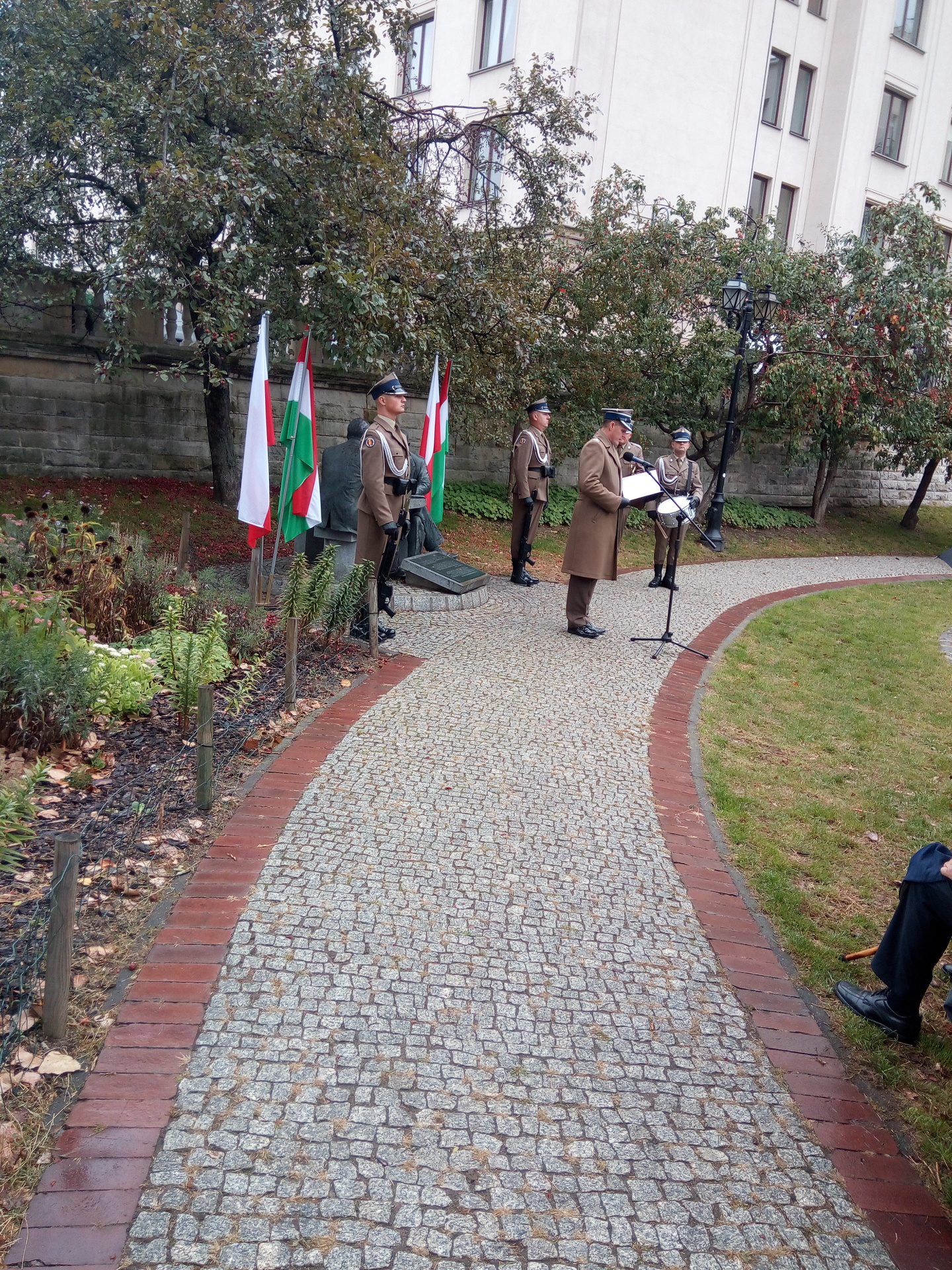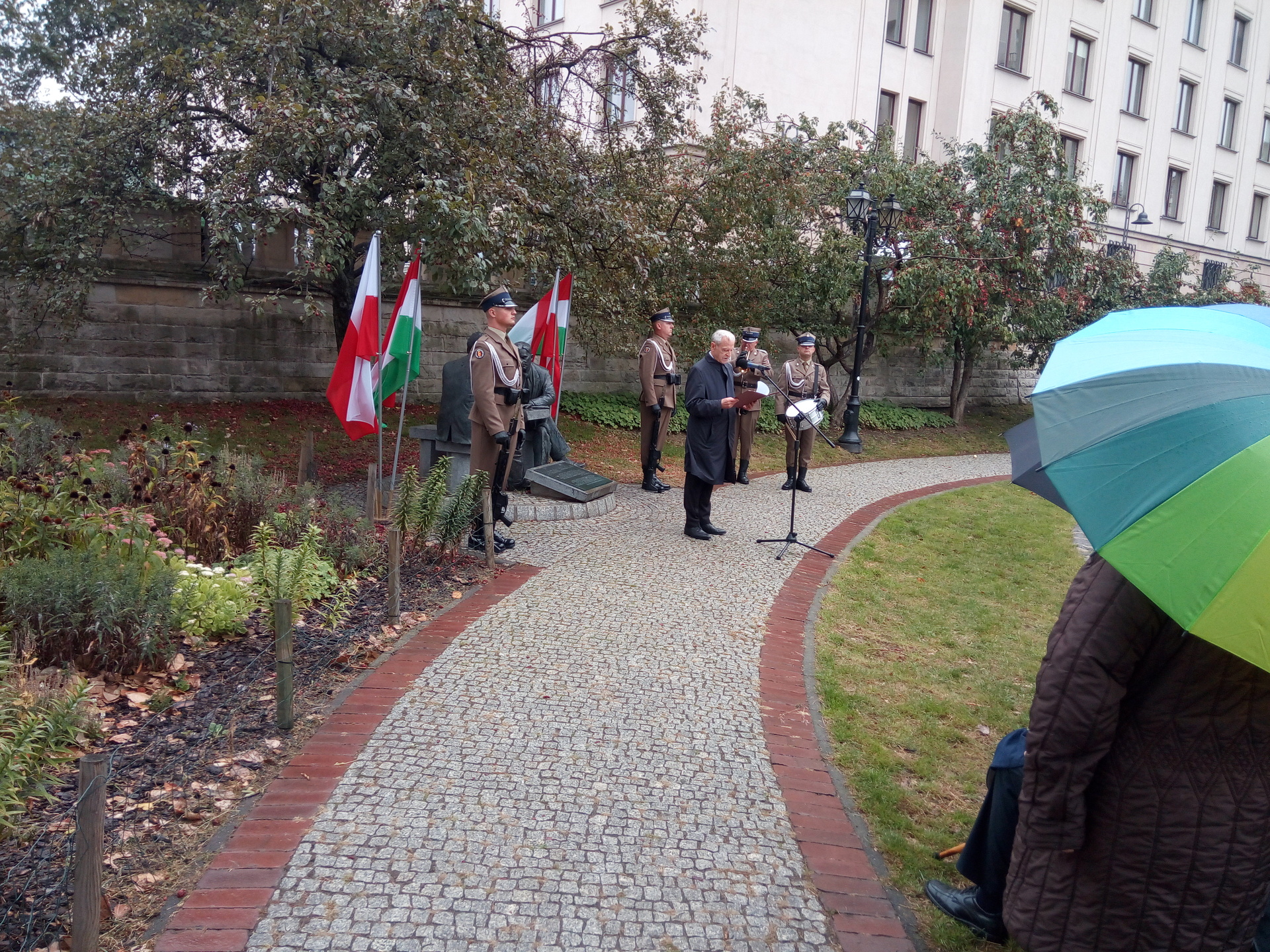 Po przywitaniu gości przez p. Grzegorza Łubczyka, b. ambasadora RP na Węgrzech, odegrano hymny Polski i Węgier. Następnie głos zabrała ambasador Węgier w Polsce p. Orsolya Zsuzsanna Kovács a po niej został odczytany list od szefa Urzędu do Spraw Kombatantów i Osób Represjonowanych. Na koniec nastąpiło złożenie wieńców i kwiatów od zaproszonych gości wśród których byli polscy uchodźcy z 1939 r.