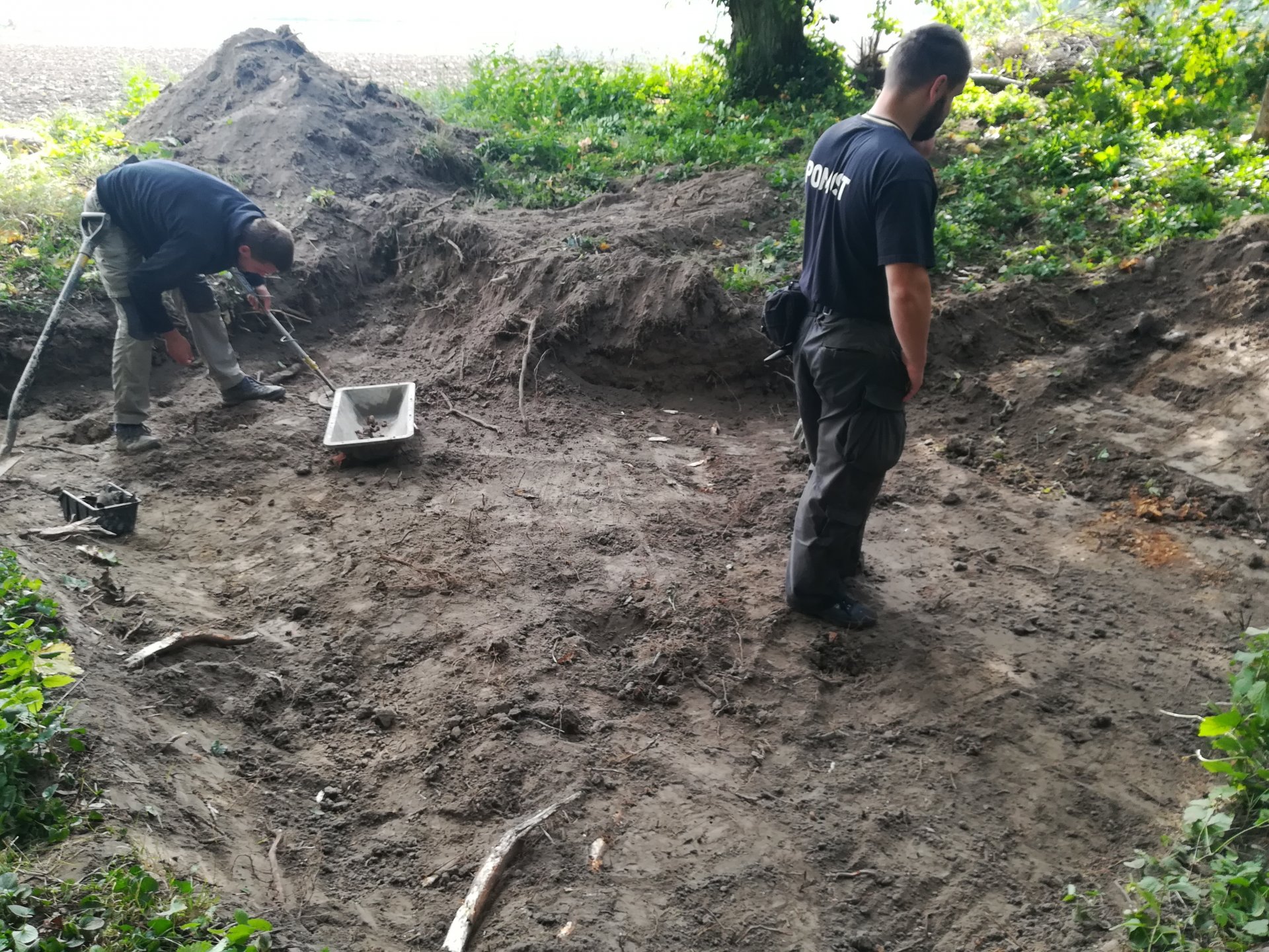 W mogile znaleziono szczątki 13 żołnierzy Wojska Polskiego. W wypełnisku jamy grobowej zarejestrowano także wyjątkowo liczny zbiór przedmiotów, w tym guziki mundurowe wz. 1919 i 1928, dewocjonalia oraz polskie monety okresu międzywojennego. Wśród nich znajduje się aluminiowy nieprzełamany znak tożsamości wz. 1931 (tzw. nieśmiertelnik). Mimo silnej korozji udało się odczytać zawarte na nim dane: