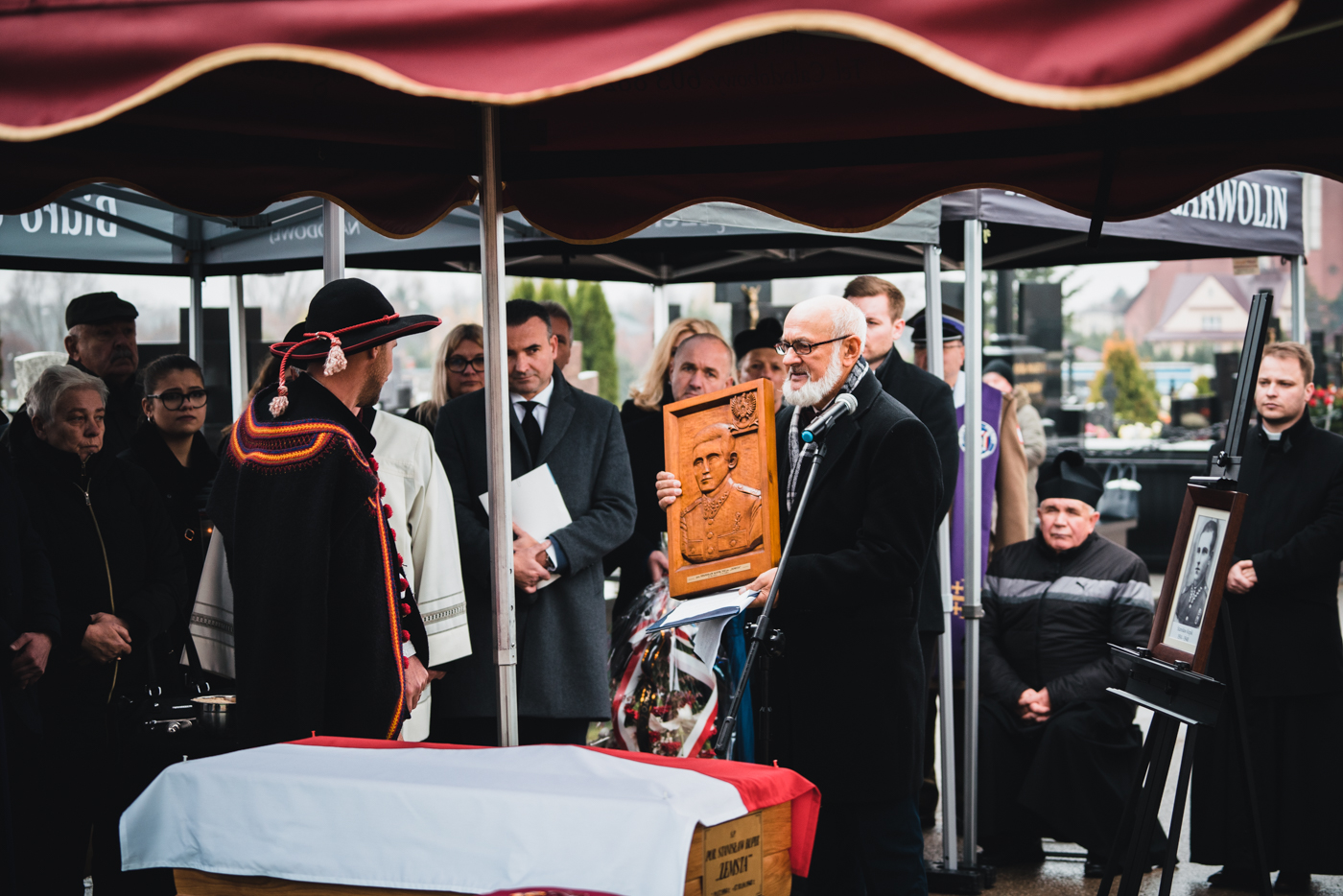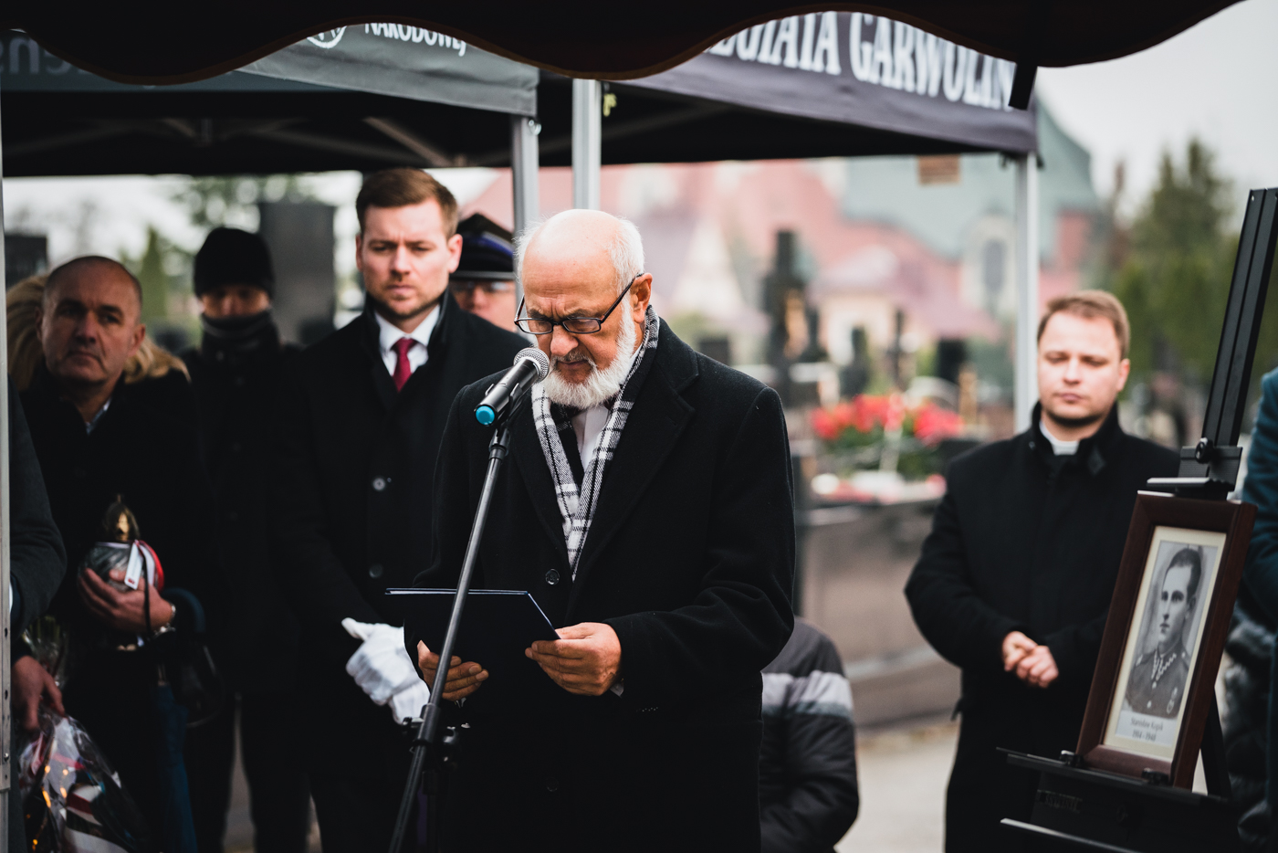 „W wigilię Narodowego Święta Niepodległości, w Kolegiacie Przemienienia Pańskiego i na cmentarzu parafialnym w Garwolinie Ojczyzna żegna Pana Porucznika, żegna swojego Bohatera; uczestnika wojny obronnej 1939, żołnierza Armii Krajowej, Wojska Polskiego, Narodowych Sił Zbrojnych, niezłomnego patriotę, walczącego z komunizmem, którego postawę wobec zwolenników narzuconego Polsce systemu politycznego najpełniej wyraził w słowach odezwy: »…uważam was za pachołków rosyjskich, z którymi nie liczyłem się i liczyć nie będę, ani też litował…«” – napisał w liście odczytanym przez mec. Annę Szeląg zastępca prezesa Krzysztof Szwagrzyk.