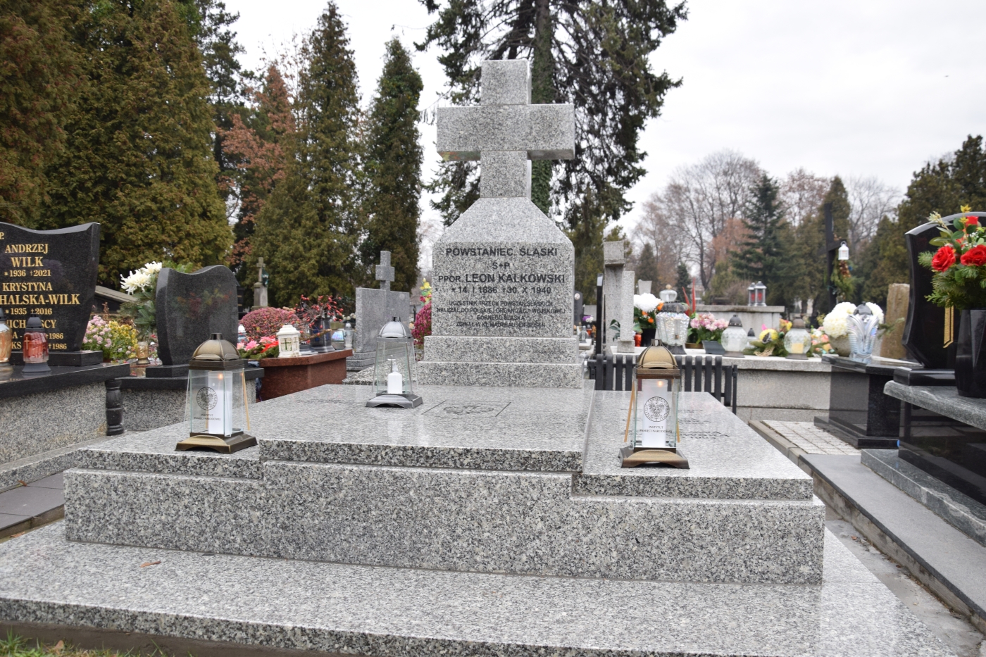 Ppor. Leon Kalkowski (s. Karola) urodził się 14 stycznia 1886 r. Brał czynny udział w trzech powstaniach śląskich oraz akcji plebiscytowej. Należał do Polskiej Organizacji Wojskowej Górnego Śląska. Podczas pierwszego powstania dowodził 9 kompanią, która walczyła na odcinku Mysłowice - Szopienice. Od 1923 r. należał do Związku Powstańców Śląskich w którym pełnił funkcję prezesa powiatowego koła w Będzinie. Został odznaczony Krzyżem Niepodległości, Krzyżem na Śląskiej Wstędze Waleczności i Zasługi, Gwiazdą Górnośląską oraz Srebrnym Krzyżem Zasługi. Podczas II wojny światowej został aresztowany 1 maja 1940 r. w Sosnowcu. W efekcie został osadzony najpierw w KL Dachau, a następnie w KL Mauthausen-Gusen, gdzie zginął 30 października 1940 r. Jego prochy zostały odesłane rodzinie, która pochowała je w grobie rodzinnym.