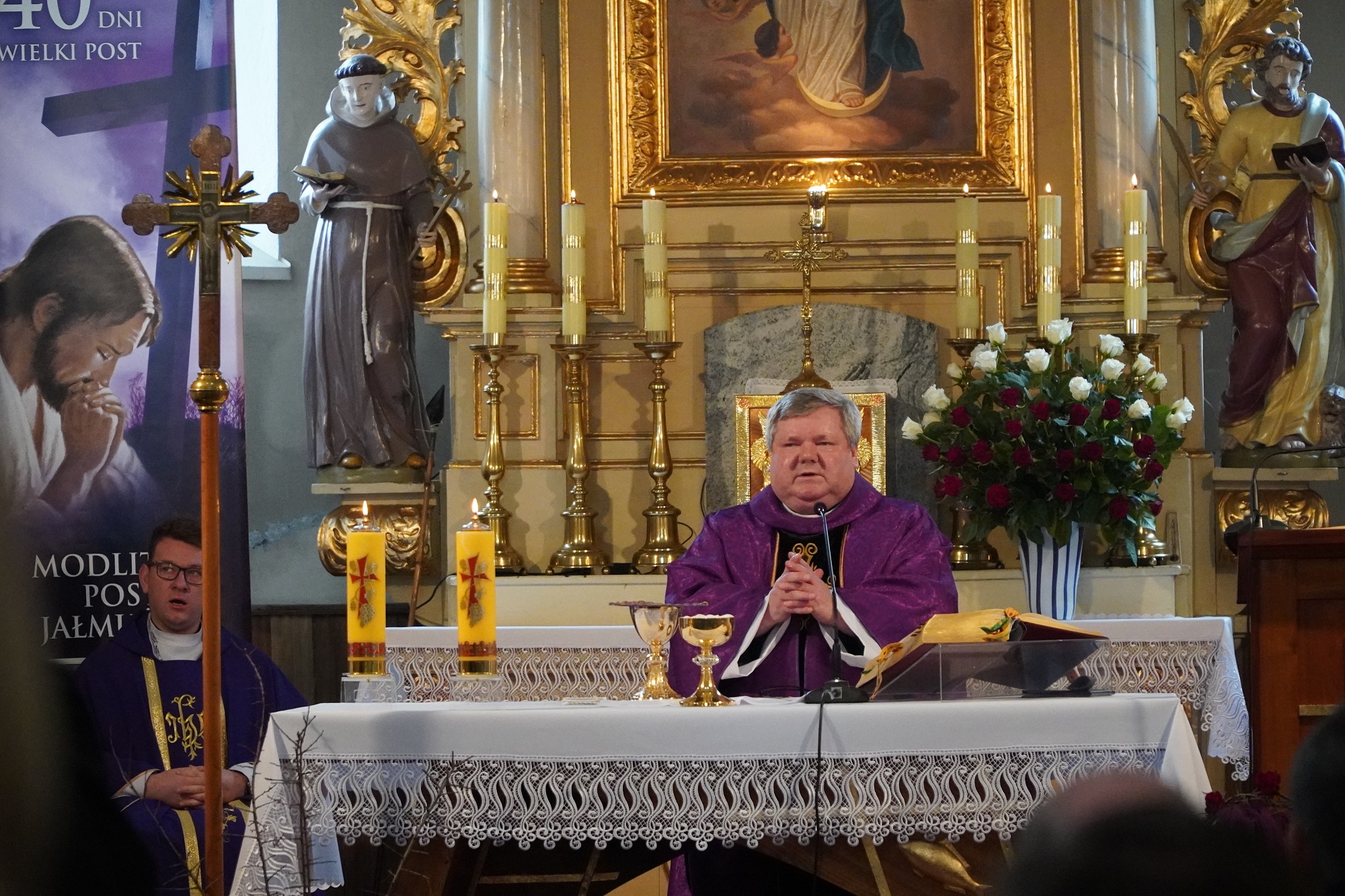 Msza św. pod przewodnictwem ks. prał. dr. hab. Waldemara Janigi, poprzedzająca odsłonięcie muralu upamiętniającego por. Franciszka Majewskiego – Tarnawka, 5 marca 2023. Fot. Marcin Bukała (IPN)