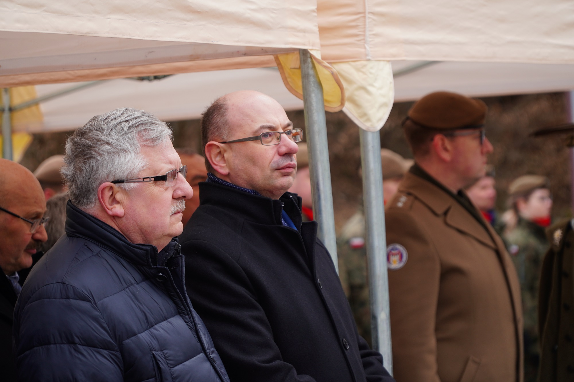 Dr Mateusz Szpytma i Kazimierz Gołojuch na uroczystości poświęcenia i odsłonięcia muralu upamiętniającego por. Franciszka Majewskiego – Tarnawka, 5 marca 2023. Fot. Marcin Bukała (IPN)