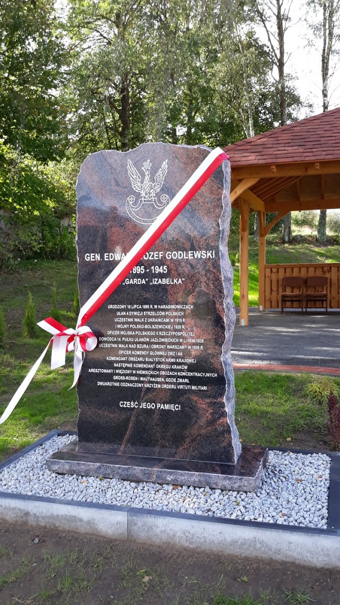 Generał brygady Edward Józef Godlewski, ps. „Garda”, „Izabelka”, urodził się 10 lipca 1895 roku w Harasimowiczach. Uczestniczył w walkach z Ukraińcami w 1919 roku i w wojnie polsko-bolszewickiej, dowodził 14. Pułkiem Ułanów Jazłowieckich w latach 1936-1939. Brał udział w bitwie nad Bzurą i w obronie Warszawy w trakcie wojny obronnej 1939 roku. W trakcie okupacji niemieckiej dołączył do Służby Zwycięstwu Polski, Związku Walki Zbrojnej i Armii Krajowej. Pełnił funkcje Inspektora Głównego Komendy Głównej Związku Walki Zbrojnej, komendanta Obszaru Białystok Armii Krajowej i komendanta Okręgu Kraków Armii Krajowej. Aresztowany 19 października 1944 roku, więziony w Krakowie w więzieniu policyjnym na Montelupich. W grudniu 1944 roku przeniesiono go obozu koncentracyjnego Gross-Rosen, skąd później trafił do Mauthausen. Tam zmarł z głodu i wycieńczenia w maju 1945 roku, na kilka dni przed wyzwoleniem obozu. Został dwukrotnie odznaczony Orderem Virtuti Militari.
