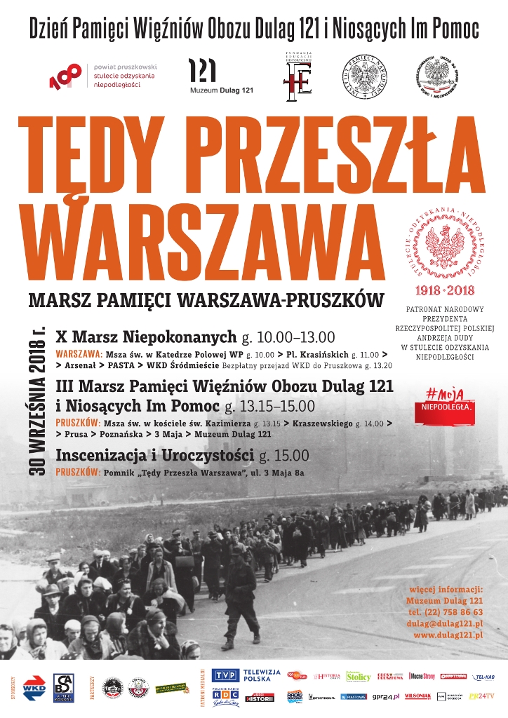 30 września zapraszamy na tegoroczne Obchody Dnia Pamięci Więźniów Obozu Dulag 121 i Niosących Im Pomoc organizowane przez Muzeum Dulag 121, Powiat Pruszkowski i Fundację Edukacji Historycznej, przy współpracy z Instytutem Pamięci Narodowej oraz Urzędem do Spraw Kombatantów i Osób Represjonowanych. Tego dnia ulicami Warszawy i Pruszkowa przejdzie Marsz Pamięci „Tędy Przeszła Warszawa”. Warszawska część marszu rozpocznie się o g. 11:00 na placu Krasińskich, pruszkowska o g. 14.00 pod kościołem św. Kazimierza przy ul. Kraszewskiego 23. W tym roku Obchody zostały objęte Patronatem Narodowym Prezydenta RP Andrzeja Dudy.