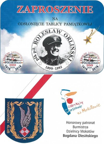 W imieniu Rady i Zarządu Dzielnicy Mokotów miasta stołecznego Warszawy oraz Warszawskiego Klubu Seniorów Lotnictwa serdecznie zapraszamy na uroczystość odsłonięcia tablicy pamiątkowej poświęconej płk. pil. Bolesławowi Orlińskiemu. Odsłonięcie odbędzie się 18 października 2018 roku o godz. 13 przy skrzyżowaniu ulic Wołoskiej i Racławickiej 94 w Warszawie, gdzie mieszkał płk pil. Bolesław Orliński.