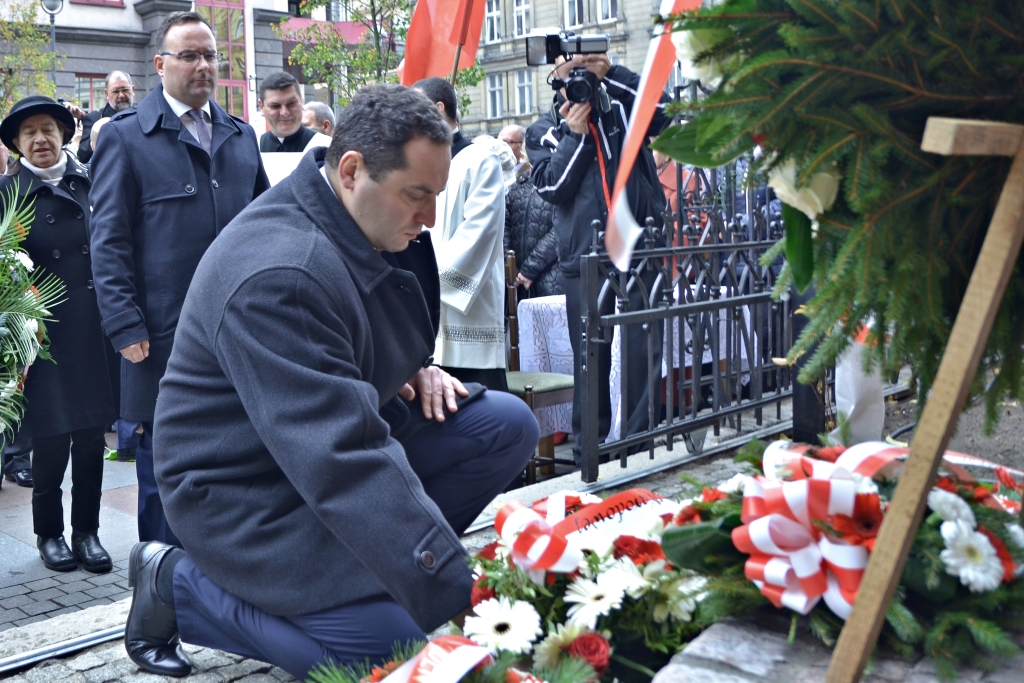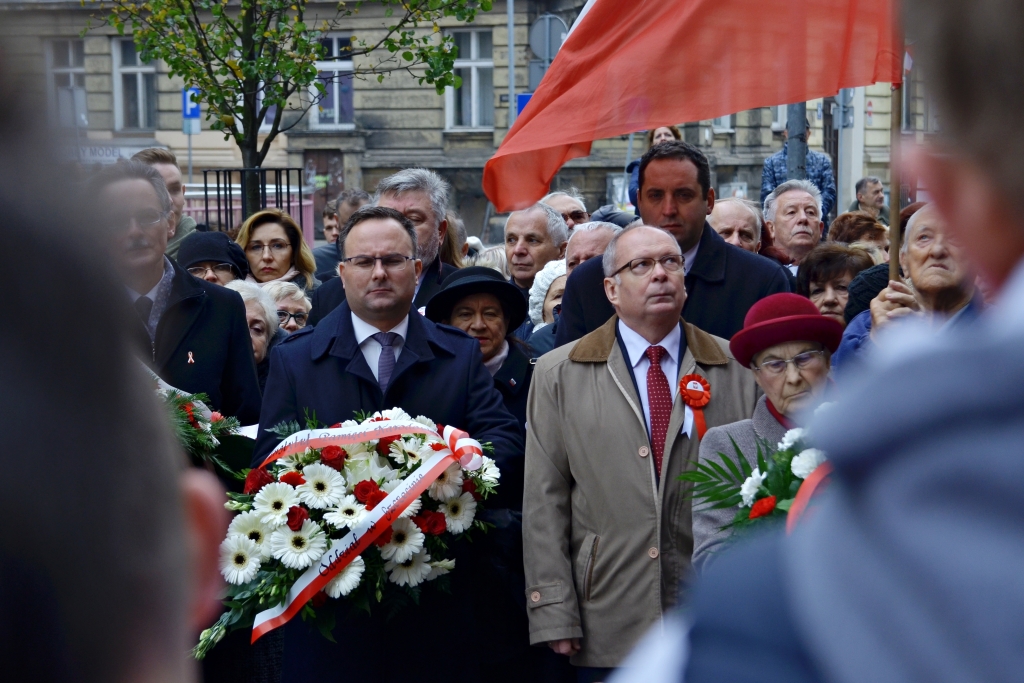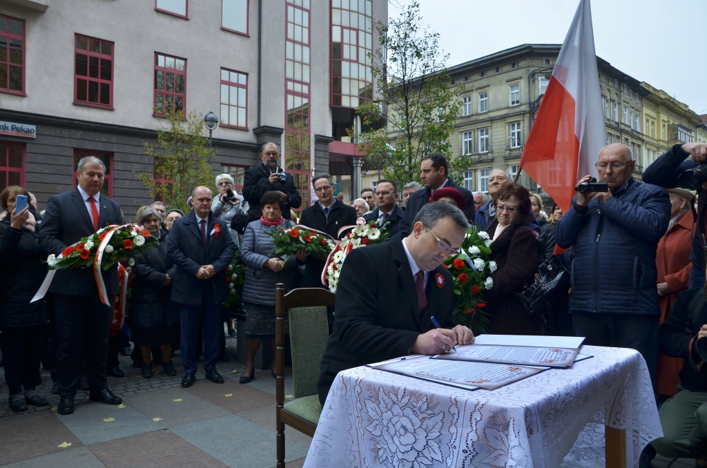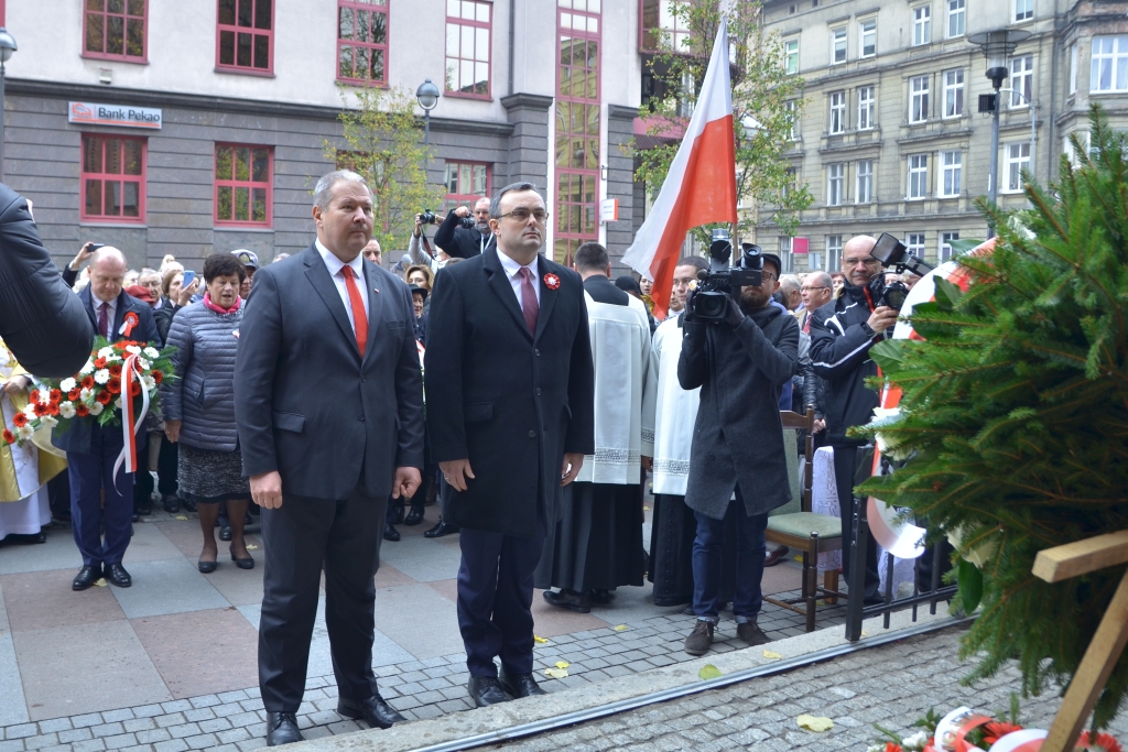 Msza święta za ojczyznę, połączona z odsłonięciem pomnika „Boże Chroń Polskę”, zainaugurowała obchody Narodowego Święta Niepodległości z udziałem pracowników Oddziału IPN w Szczecinie. Pomnik, który stanął przy bazylice św. Jana Chrzciciela przy ul. Bogurodzicy, upamiętnia setną rocznicę odzyskania przez Polskę niepodległości. Akt erekcyjny, obok m.in. wojewody zachodniopomorskiego i prezydenta Szczecina, podpisał dyrektor Oddziału IPN w Szczecinie dr Paweł Skubisz, a wspólnie z nim kwiaty pod pomnikiem złożył także naczelnik Oddziałowego Biura Upamiętniania Walki i Męczeństwa Krzysztof Męciński. To przy wsparciu merytorycznym tego biura powstał pomnik, a wykonanie postumentu oraz elementów figuralnych zostało sfinansowane ze środków Biura Upamiętniania Walk i Męczeństwa.