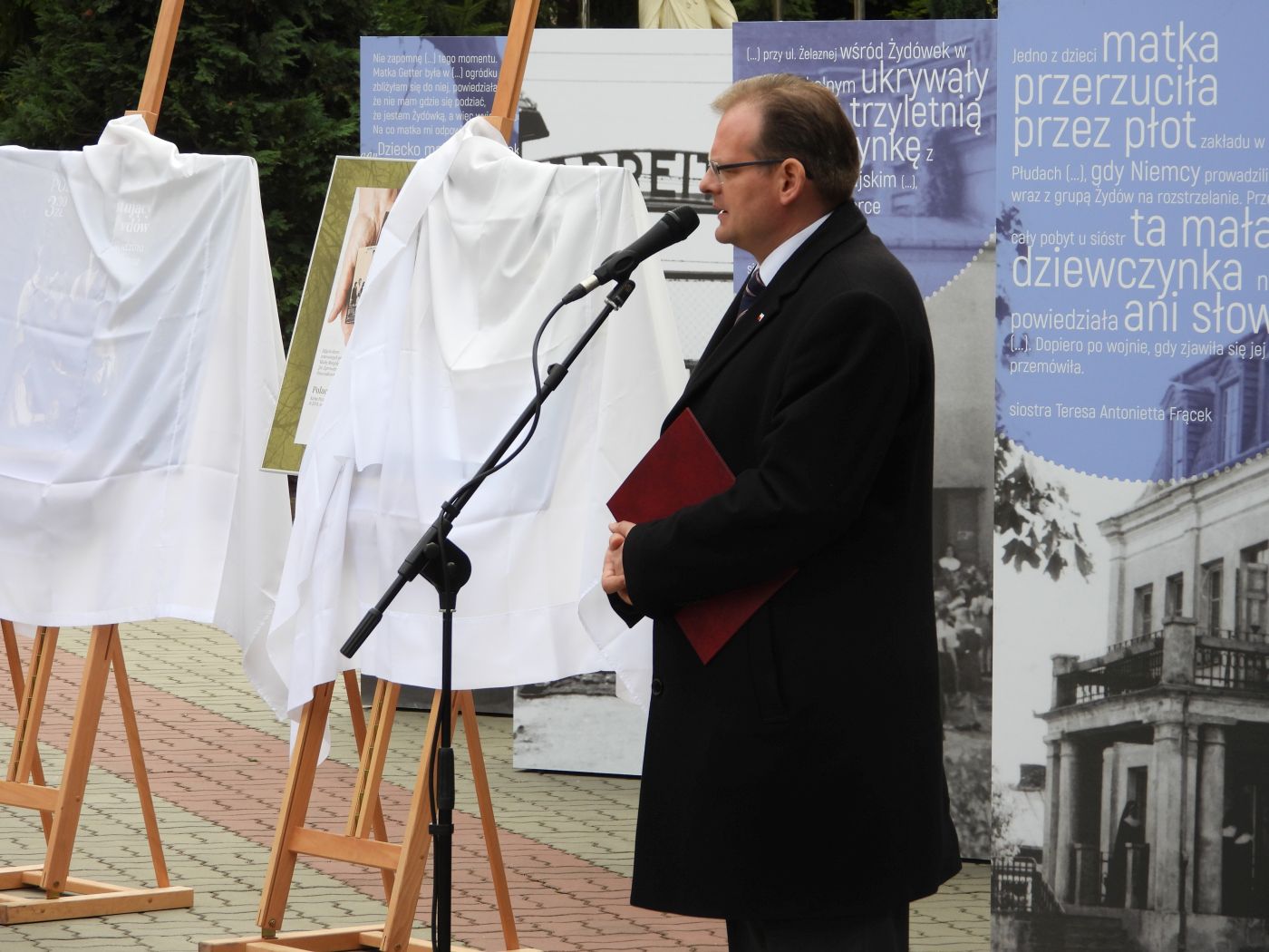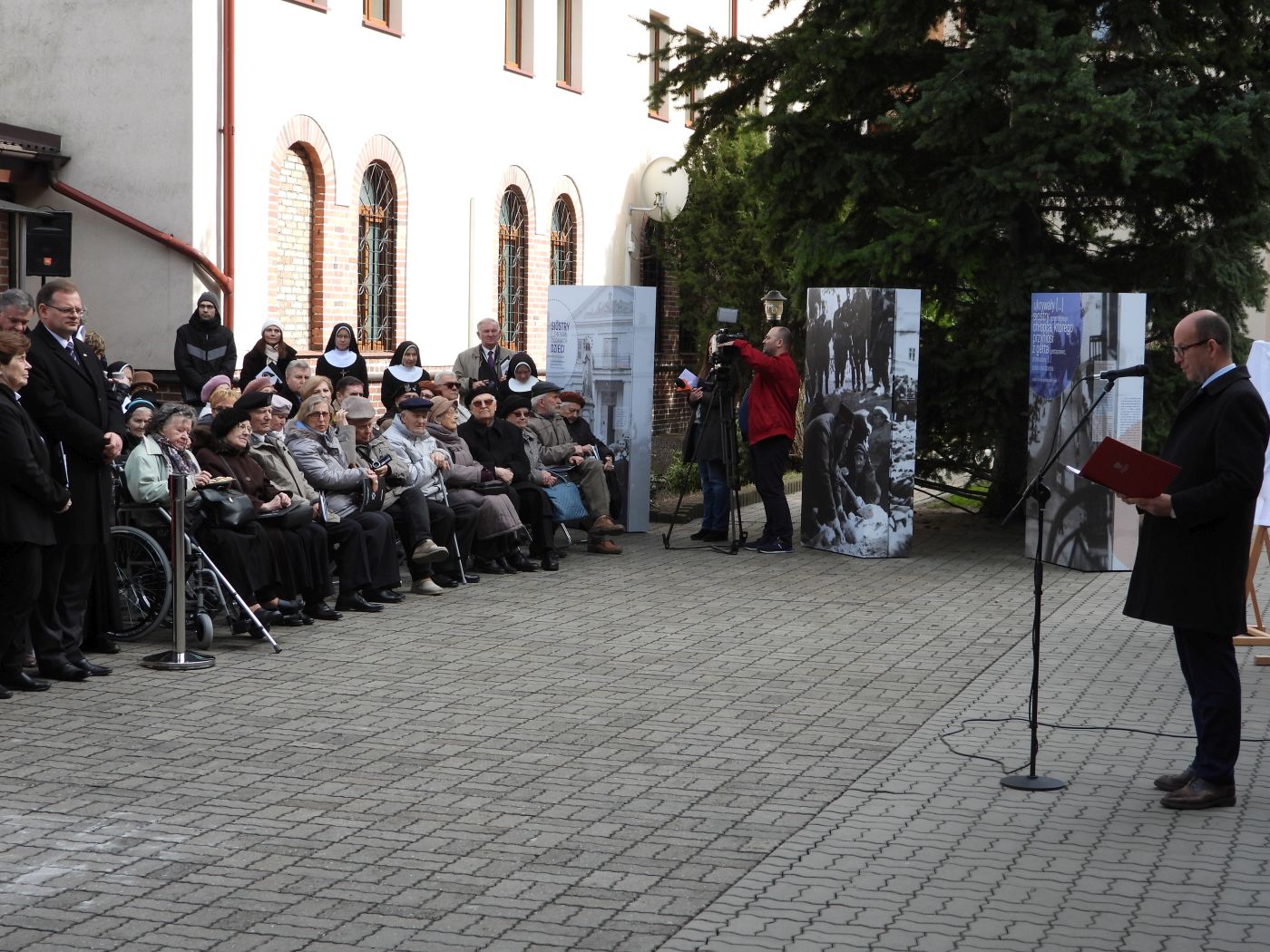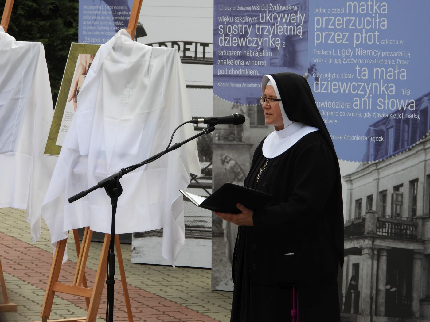 Przemówienie wygłosił prezes Instytutu Pamięci Narodowej dr Jarosław Szarek, który podkreślił, że „czas okupacji niemieckiej to czas terroru, przemocy, nienawiści, łapanek, do których dochodziło niedaleko stąd, ale ta brama, przez którą przechodziliśmy w tym ceglanym murze, przed laty była bramą do życia, takie bramy były w kilkudziesięciu ochronkach i sierocińcach prowadzonych przez siostry franciszkanki Rodziny Maryi, w tym matkę Matyldę Getter”. Na koniec wystąpienia prezes Szarek otworzył wystawę „Siostry, (…) matkami żydowskich dzieci. Siostry Franciszkanki Rodziny Maryi wobec zagłady Żydów w czasie II wojny światowej”.