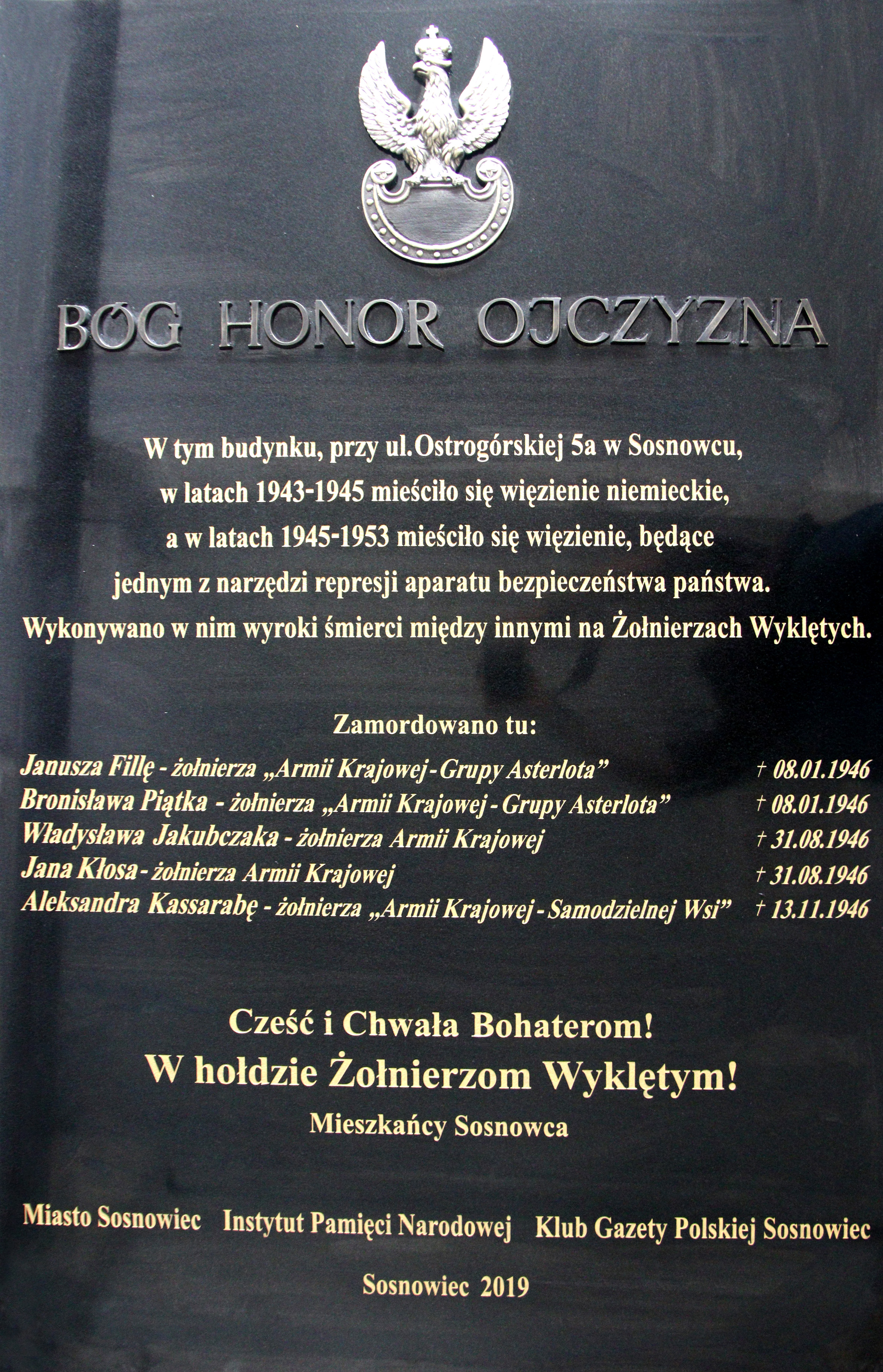 W sobotę 18 maja 2019 r. odbyło się uroczyste odsłonięcie tablicy upamiętniającej Żołnierzy Wyklętych, którzy za działalność na rzecz obalenia ustroju komunistycznego zostali skazani na karę śmierci, a wyrok wykonano w więzieniu przy ul. Ostrogórskiej w Sosnowcu. Tablica została odsłonięta przed budynkiem, w którym w latach 1943-1945 mieściło się więzienie niemieckie, a w latach 1945-1953 – więzienie komunistyczne. Uroczystość rozpoczęła się mszą świętą, która została odprawiona w południe w Bazylice Katedralnej Wniebowzięcia NMP. Po nabożeństwie uczestnicy uroczystości przeszli na ul. Ostrogórską 5a, gdzie nastąpiło uroczyste odsłonięcie i poświęcenie tablicy.