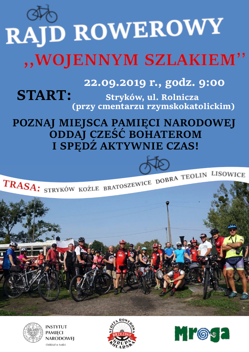 Oddziałowe Biuro Upamiętniania Walk i Męczeństwa IPN w Łodzi zaprosiło 22 września 2019 r. na drugą edycję rajdu rowerowego „Wojennym szlakiem”. Podczas tegorocznego objazdu, którego tematyka wpisała się w 80. rocznicę wybuchu II wojny światowej, uczestnicy odwiedzili upamiętnienia (pomniki, groby wojenne i groby weteranów) bohaterów walk o wolność i niepodległość Polski. czestnicy rajdu zostali także zapoznani ze specyfiką pracy i zadaniami wchodzącymi w zakres Biura Upamiętniania walk i Męczeństwa IPN.
