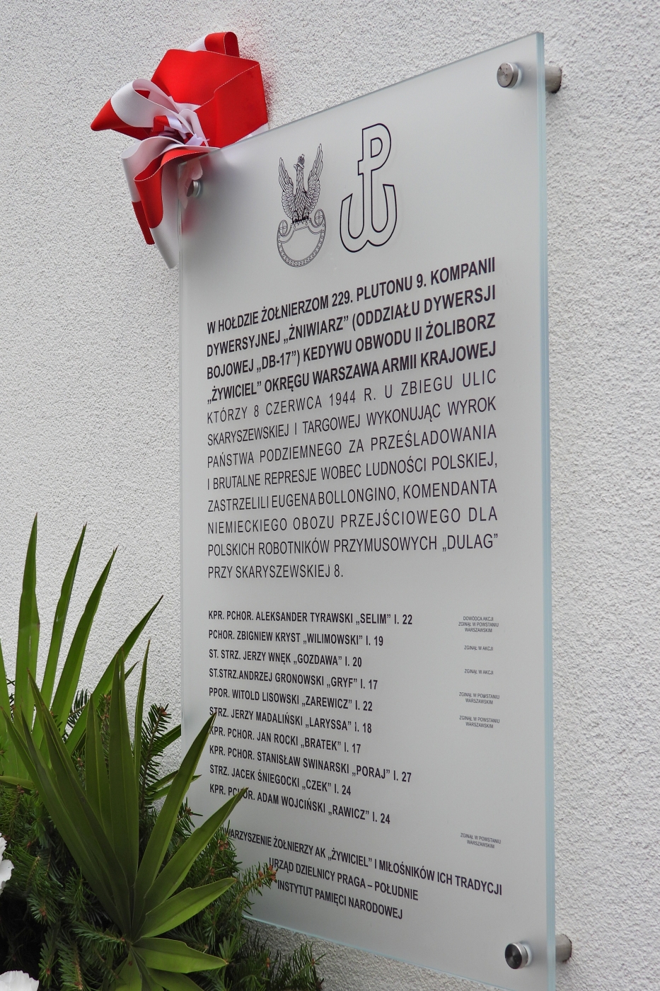 26 września 2019 r., przy ul. Skaryszewskiej 2 w Warszawie, odbyły się uroczystości odsłonięcia oraz poświęcenia tablicy w hołdzie Żołnierzom 229. Plutonu 9. Kompanii dywersyjnej „Żniwiarz” (oddziału dywersji bojowej „DB-17”) Kedywu obwodu II Żoliborz „Żywiciel” Okręgu Warszawa Armii Krajowej, którzy 8 czerwca 1944 r. u zbiegu ulic Skaryszewskiej i Targowej, wykonując wyrok państwa podziemnego za prześladowania i brutalne represje wobec ludności polskiej, zastrzelili Eugena Bollongino – komendanta niemieckiego obozu przejściowego dla polskich robotników przymusowych „Dulag” przy Skaryszewskiej 8.