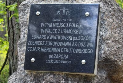 22 września 1946 r. o świcie, żołnierze dwóch plutonów zgrupowania Zrzeszenia WiN mjr. Hieronima Dekutowskiego "Zapory" kwaterujący na skraju niewielkiej leśnej osady Świnki w Lasach Janowskich zostali zaatakowani przez grupę pościgową UB/MO/KBW. Mimo zaskoczenia, wyczerpanym dwumiesięcznym rajdem po Podkarpaciu lecz doświadczonym partyzantom podziemia niepodległościowego udało się odskoczyć i nawet zadać napastnikom straty. Niestety w czasie walki poważnie rannych zostało także dwóch podkomendnych "Zapory". Jeden z nich - Edward Kwiatkowski ps. "Sokół", pomimo starań sanitariuszki Barbary Nagnajewicz "Krysi" zmarł i został pośpiesznie pochowany nieopodal pola walki przez kolegów z oddziału.