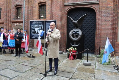 Prof. Krzysztof Mikulski przypomniał historię pomnika i jego rekonstrukcji. Zaznaczył, że orzeł będzie stał na dziedzińcu Ratusza Staromiejskiego do sierpnia 2020 r., kiedy to stanie na monumencie wykonanym z granitu w miejscu przedwojennej lokalizacji pomnika. Jednocześnie podziękował Prezydentowi Torunia, Radzie Miasta i Instytutowi Pamięci Narodowej za wsparcie jego odbudowy.