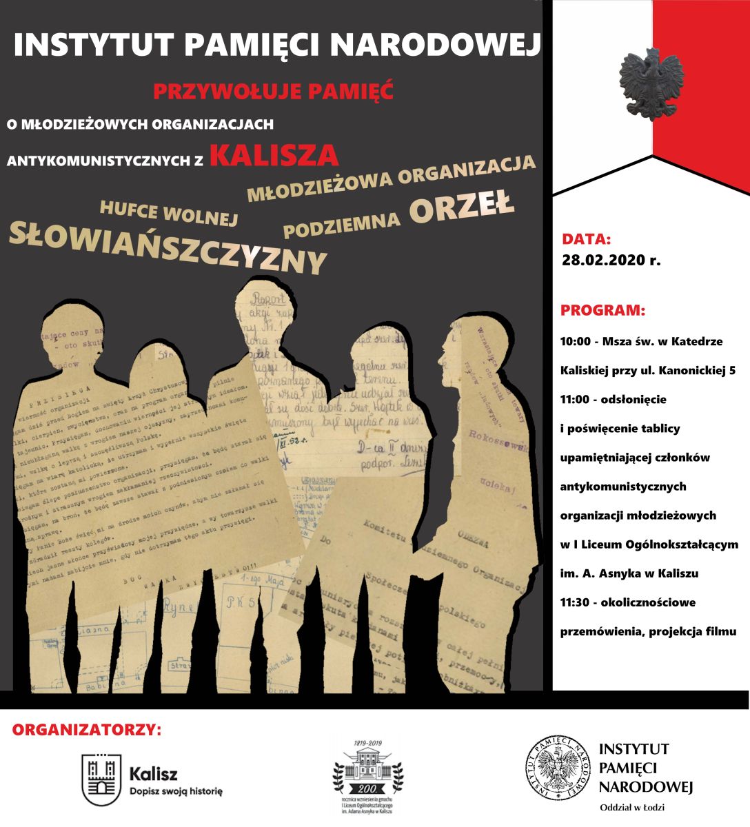 Oddział Instytutu Pamięci Narodowej w Łodzi, Urząd Miasta Kalisza oraz I Liceum Ogólnokształcące im. Adama Asnyka w Kaliszu zaprosiły 28 lutego 2020 r. na uroczystość odsłonięcia tablicy upamiętniającej członków młodzieżowych organizacji antykomunistycznych: „Hufce Wolnej Słowiańszczyzny” i „Młodzieżowa Organizacja Podziemna – Orzeł”, działających na terenie Kalisza od lutego do lipca 1948 r. oraz od września do listopada 1952 r.