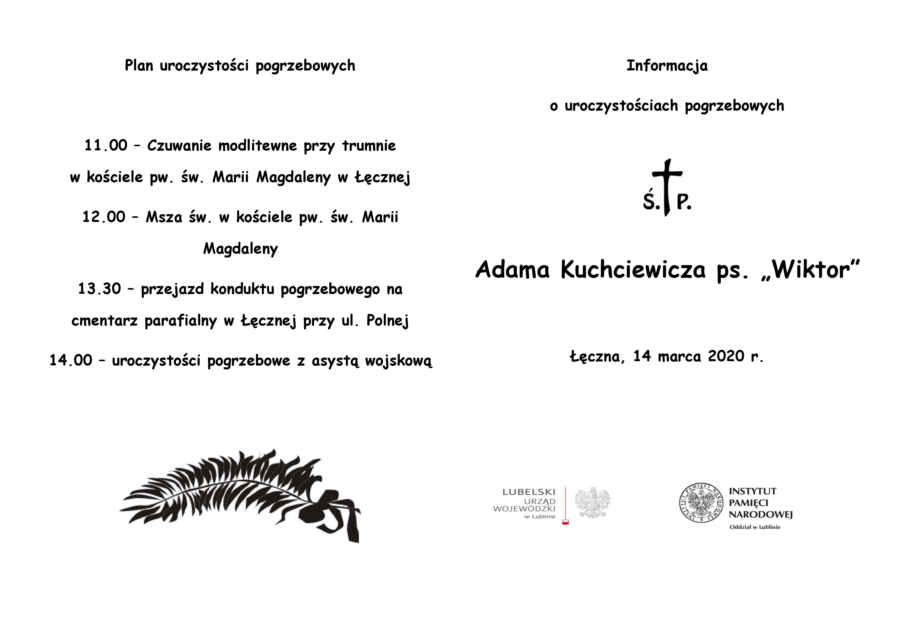 Uroczysty pogrzeb Adama Kuchciewicza odbędzie się 14 marca 2020 r. w Łęcznej. Weźmie w nim udział zastępca prezesa IPN oraz dyrektor Biura Poszukiwań i Identyfikacji IPN prof. Krzysztof Szwagrzyk.