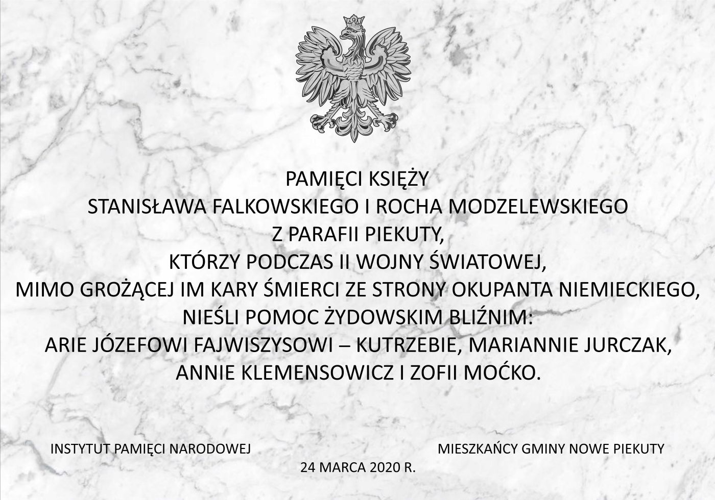 24 marca 2020 roku obchodzimy po raz trzeci Narodowy Dzień Pamięci Polaków ratujących Żydów pod okupacją niemiecką. Święto to ustanowiono – jak zapisano w treści ustawy – „w hołdzie Obywatelom Polskim – bohaterom, którzy w akcie heroicznej odwagi, niebywałego męstwa, współczucia i solidarności międzyludzkiej, wierni najwyższym wartościom etycznym, nakazom chrześcijańskiego miłosierdzia oraz etosowi suwerennej Rzeczypospolitej Polskiej, ratowali swoich żydowskich bliźnich od Zagłady zaplanowanej i realizowanej przez niemieckich okupantów”.