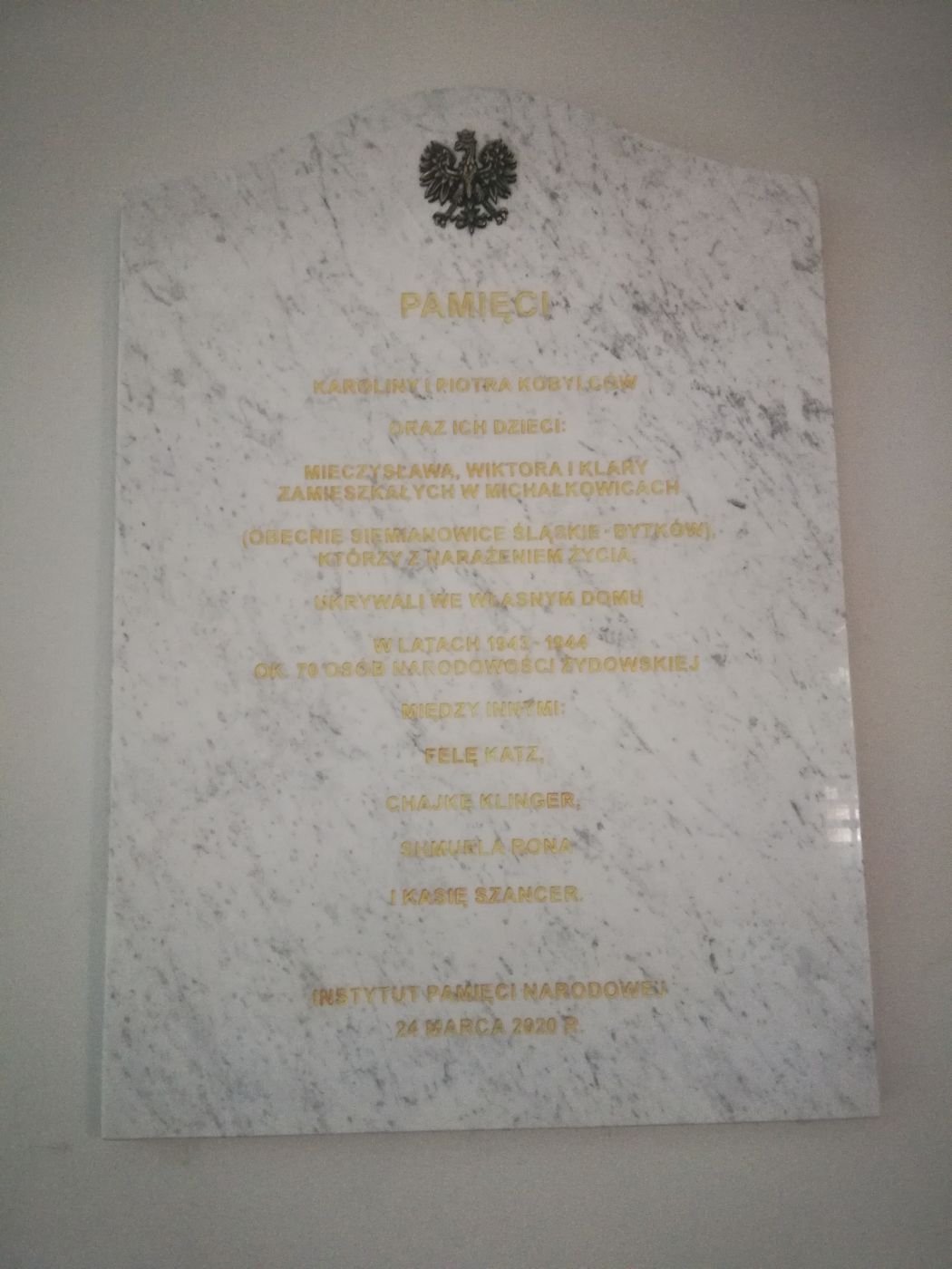 Oddział IPN Katowice ufundował tablicę, która będzie upamiętniać rodzinę Kobylców z Michałkowic (dziś Siemianowic Śląskich Bytkowa). Zostanie ona zamontowana w Zespole Szkół Sportowych w Siemianowicach Śląskich, w budynku Szkoły Podstawowej nr 8 przy placu Skrzeka i Wójcika 4. Szkoła jest oddalona o 400 m. od historycznego budynku, w którego skrytce, w czasie II wojny światowej, znalazło schronienie kilkadziesiąt osób narodowości żydowskiej. Uroczystość odsłonięcia z udziałem członków Rodziny Kobylców, zaproszonych gości i uczniów szkoły odbędzie się w terminie późniejszym.