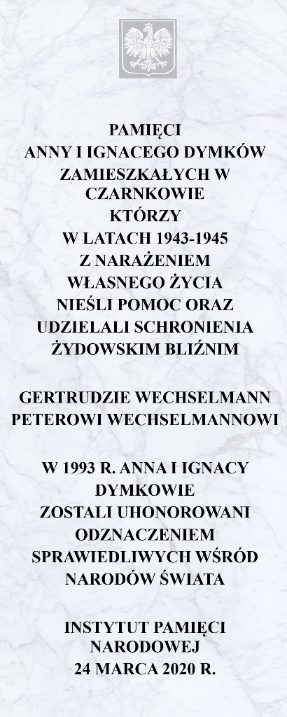 Tablica upamiętnia małżeństwo Anny oraz Ignacego Dymków, którzy w latach 1943–1945 na terenie Czarnkowa udzielali schronienia Gertrudzie oraz Peterowi Wechselmannom.