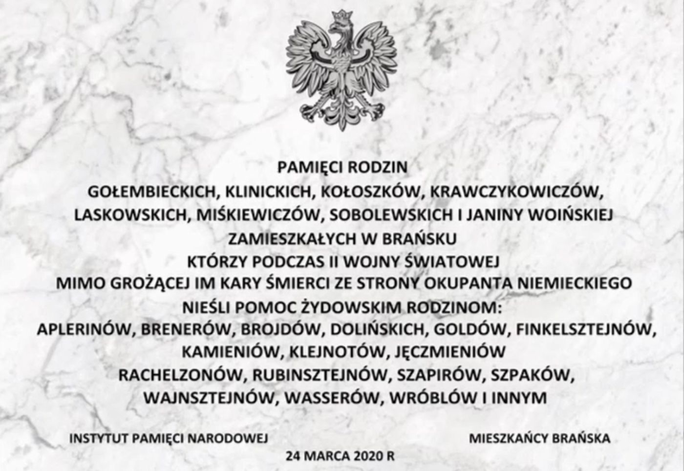 Tablica upamiętnia rodziny Gołembieckich, Klinickich, Kołoszków, Laskowskich, Miśkiewiczów, Sobolewskich oraz farmaceutkę Janinę Woińską oraz osoby ocalone z żydowskich rodzin z Brańska i okręgu białostockiego: Alperinów, Brenerów, Brojdów, Dolińskich, Goldów, Finkelsztejnów, Jęczmieniów, Kamieniów, Klejnotów, Rachelzonów, Rubinsztejnów, Szapirów, Szpaków, Wajnsztejnów, Wasserów, Wróblów (w latach 1942-1944).