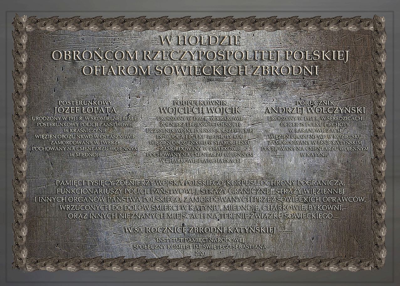 - Tablica ku czci oficerów WP, Policji Państwowej i KOP – ofiar zbrodni katyńskiej, Skomielna Biała (pow. myślenicki) – 13 września 2020 odsłonięta została, ufundowana przez krakowski IPN, tablica poświęcona oficerom Wojska Polskiego, Policji Państwowej i Korpusu Ochrony Pogranicza. Na tablicy zostali upamiętnieni: posterunkowy Józef Łopata, ppłk Wojciech Wójcik i por. Andrzej Wólczyński. Józef Łopata urodził się w Skomielnej Białej i pełnił funkcję posterunkowego w Kraśniczynie. Wojciech Wójcik we wrześniu 1939 r. dowodził 1. Pułkiem Piechoty KOP, broniąc pobliskiej Wysokiej i Jordanowa, a jego sztab znajdował się w Skomielnej Białej. Andrzej Wólczyński był oficerem 78. Pułku Piechoty w Baranowiczach – ze Skomielną związana była jego najbliższa rodzina.