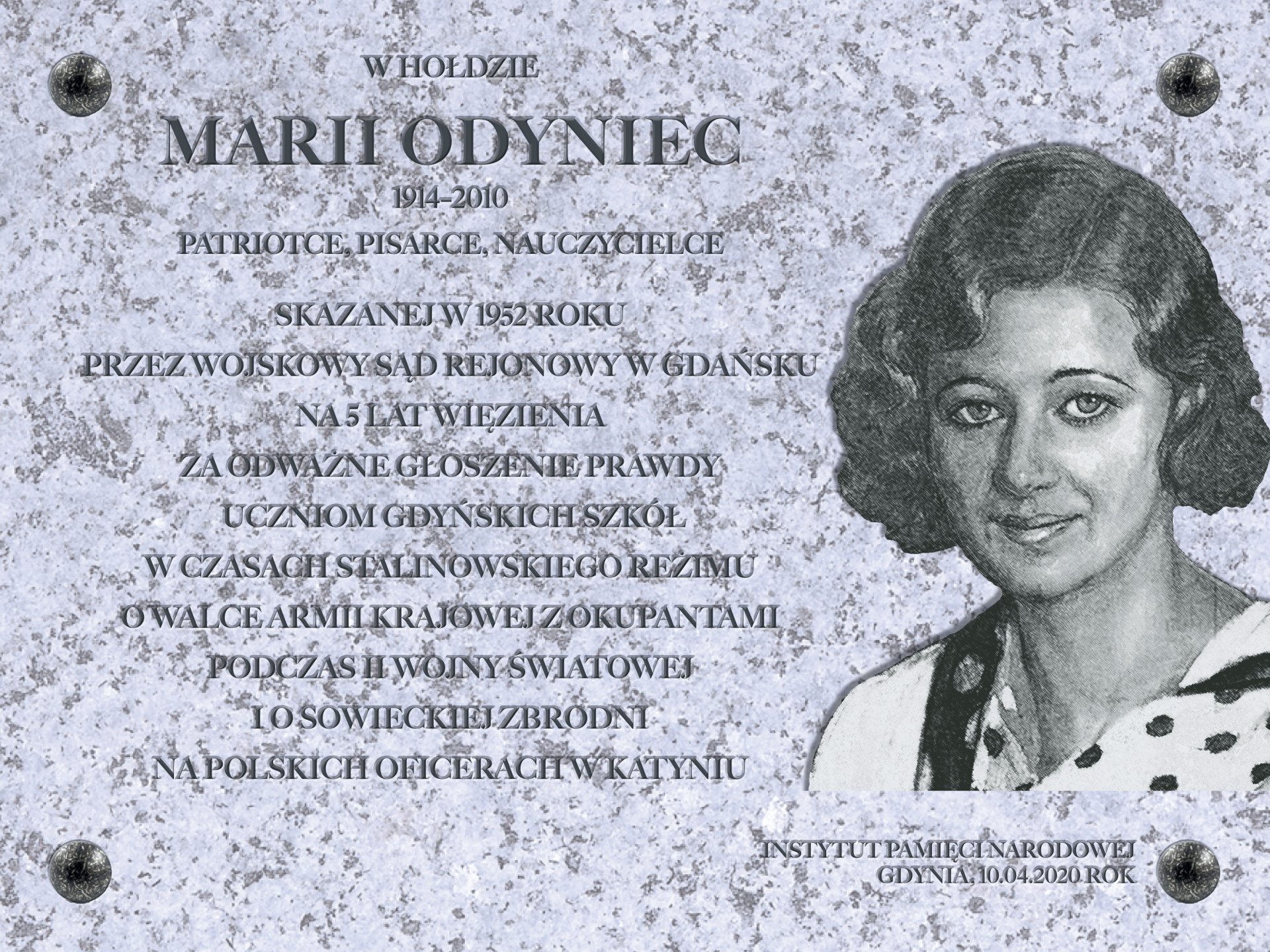 Maria Odyniec (1914-2010) była nauczycielką, która w czasach stalinowskich nie bała się głosić prawdy o Zbrodni Katyńskiej. Za swoją postawę została skazana na 5 lat więzienia. Jej pierwszy mąż, Tadeusz Szefer, brał udział w wojnie obronnej, dostał się do niewoli sowieckiej, był przetrzymywany w obozie w Starobielsku i w 1940 r. został zamordowany przez NKWD w Charkowie.