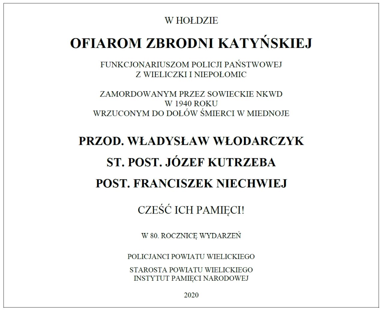Tablica na głazie pamięci przed Komendą Powiatową Policji w Wieliczce, poświęcona policjantom – ofiarom Zbrodni Katyńskiej. Pomnik poświęcony jest funkcjonariuszom Policji Państwowej z Wieliczki i Niepołomic: przod. Władysławowi Włodarczykowi, st. post. Józefowi Kutrzebie i post. Franciszkowi Niechwiejowi, zamordowanym w Kalininie (obecnie Twer), pogrzebanym w dołach śmierci w Miednoje. Upamiętnienie zostało zrealizowane w 2020.