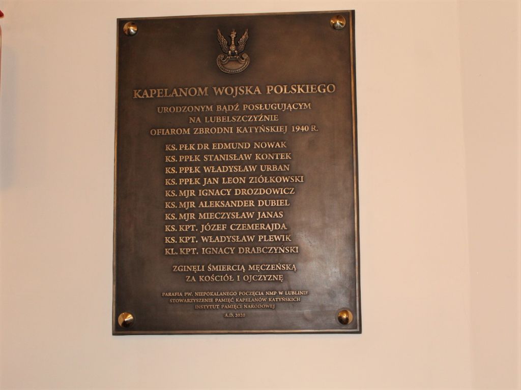 10 listopada 2020 w Kościele Garnizonowym pw. Niepokalanego Poczęcia NMM w Lublinie została zamieszczona tablica upamiętniająca kapelanów Wojska Polskiego – ofiary Zbrodni Katyńskiej, którzy urodzili się bądź posługiwali na Lubelszczyźnie.
